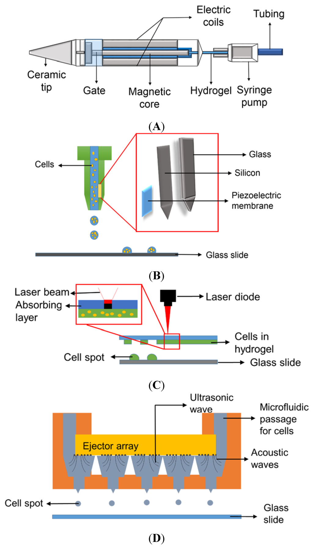 Various mechanisms for printing biological samples: (A) Micro-solenoid valve using electromagnetic induction; (B) Piezoelectric nozzle using piezoelectric vibration; (C) Laser-induced forward transfer (LIFT) using a laser beam to propel cell spots [13], and (D) Acoustic wave generator using ultrasound to produce acoustic waves for cell printing (Reproduced from Reference [23] with permission of The Royal Society of Chemistry).