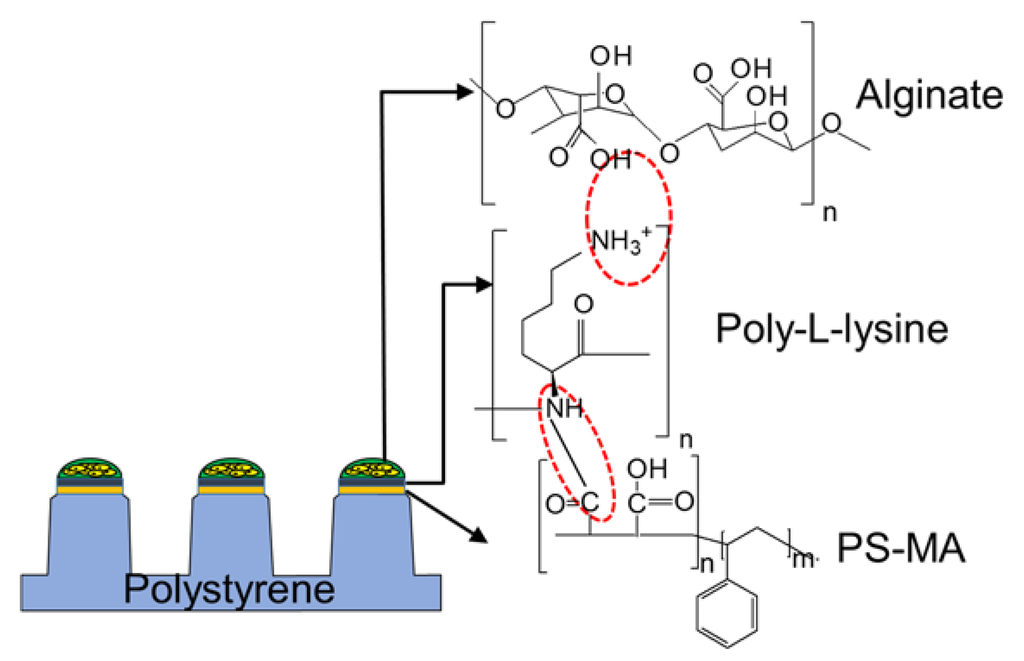 Chemical and ionic interactions among polystyrene-co-maleic anhydride (PS-MA), poly-l-lysine (PLL), and alginate that support cell spots to adhere to the surface of the micropillar chip.