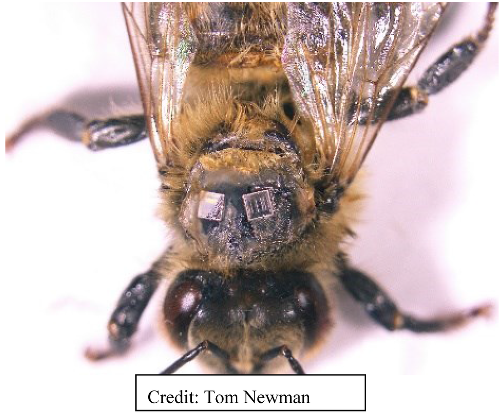 DARPA funded the next iteration of even smaller RF chips in late 1999. We also tested miniature radio frequency (RF) pit tags and hive-mounted readers developed for us by a group of engineers directed by Ron Gilbert at Pacific Northwest Laboratory. Each 27 mg RF tag was about half the size of a rice grain and contained a 10-character code which identified an individual bee. When the bee entered or exited the hive, an electronic tag reader recorded the passage. Unfortunately, we concluded that our miniature chip was still large enough to alter normal bee flight and that read range was limited to centimeters [59].
