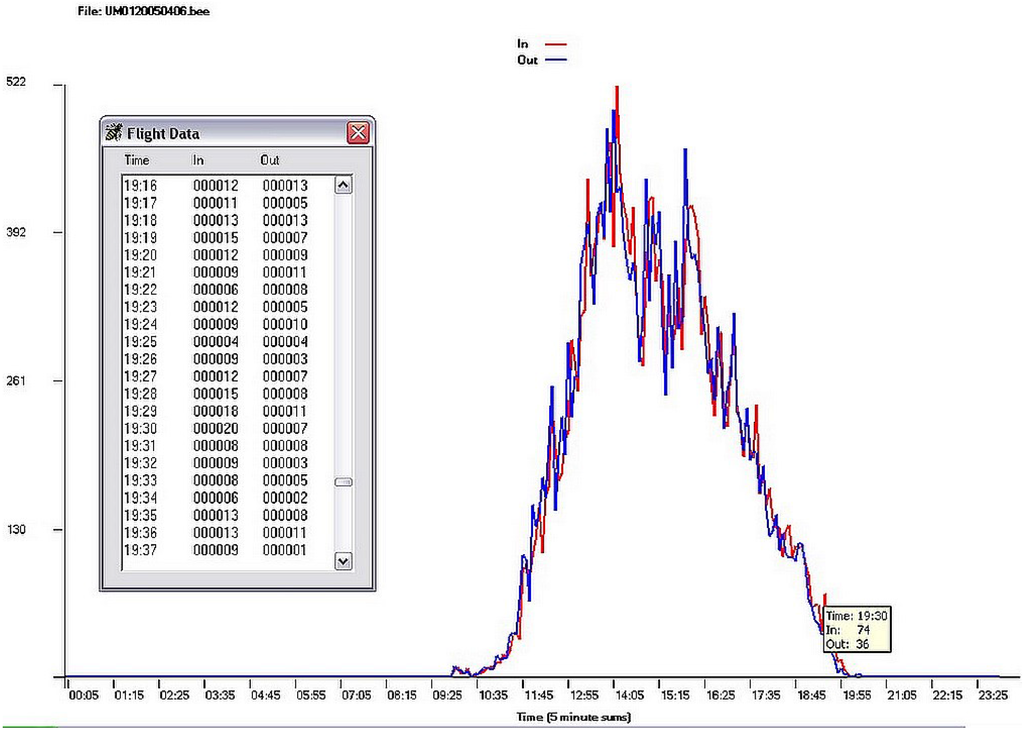 These hand-built bee-counting units tend to be expensive and not well-suited to everyday colony management, although the cost has been warranted for some critical research and monitoring projects. We have experimented with alternative technologies for IR-based counters including: capacitance-based counters, visual and infrared image subtraction, still and video imagery (DARPA initiated projects, all documented in our Annual Technical Reports, 1999–2002 [82]). We found IR-based counter systems to be more robust and accurate than capacitance and video-based systems, but IR counters require regular cleaning and maintenance. Our counters have a self-diagnostic program that allows the user to check whether all of the emitters and detectors are working and that none of the passageways are blocked by debris or bees. We developed data summary applications for Windows computers in 1995, later adding touch-sensitive tablets and cell phones (Figure 7).