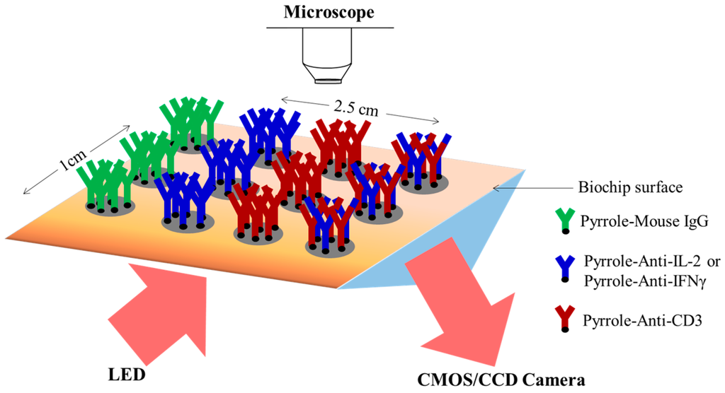 General scheme describing the design of the biochip for the capture of T-cell and the detection of secreted cytokines. Pyrrole-conjugated cell- and cytokine-specific antibodies (Anti-CD3, anti-IL-2 or anti-IFN-γ, and Mouse IgG as negative isotypic control) are electrochemically grafted side-by-side or mixed on the biochip surface (~300–400 µm of spot diameter). The grafted biochip is subsequently treated with Thiol-PEG to prevent nonspecific adhesion of cells on unfunctionalized regions across the biochip surface.