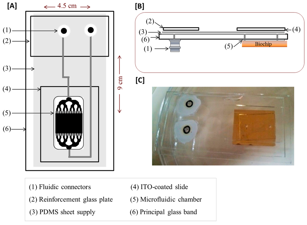 The design of the microfluidic platform integrated with the antibody-based biochip. (A) 2D view and presentation of different parts; (B) side view; and (C) picture of the device.