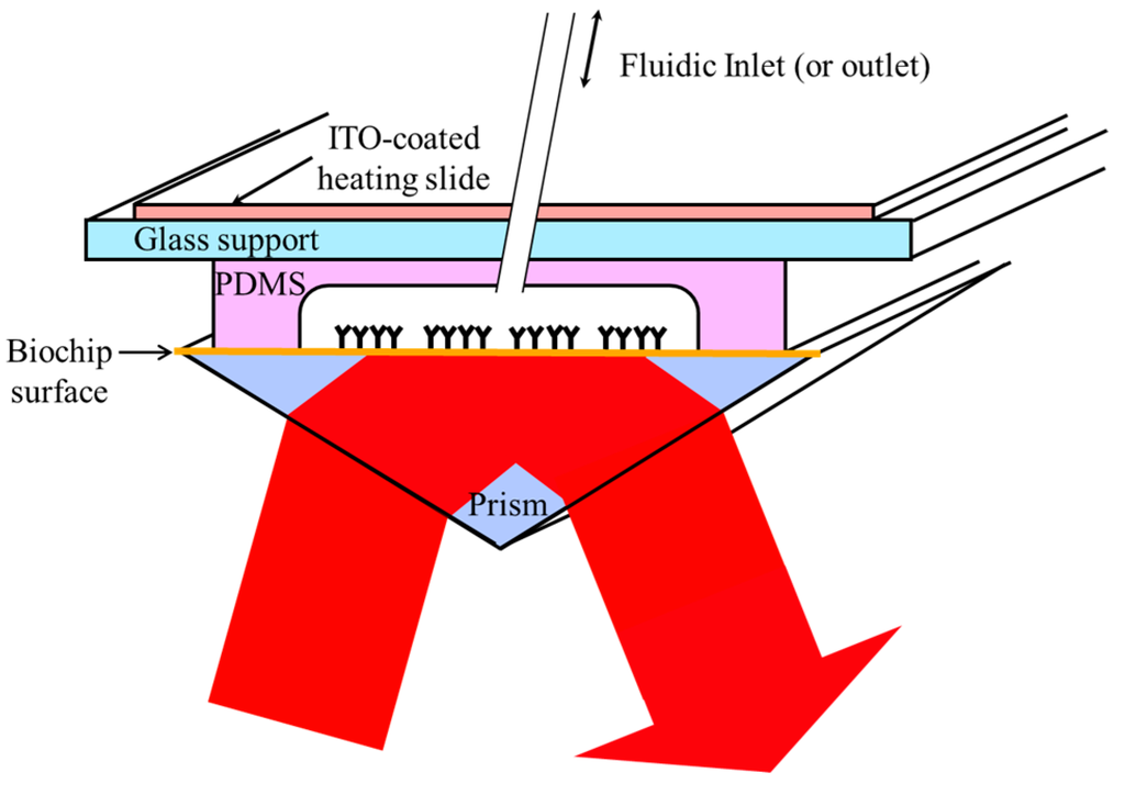 General scheme describing the SPRi set-up. The system is built in layers starting from the biochip (prism) surface at the bottom, the PDMS chamber with the fluidic inlet/outlet, the glass support, and the ITO-coated glass slide for heating and thermal regulation. A laser LED of a wavelength of 735 nm is used as light source.