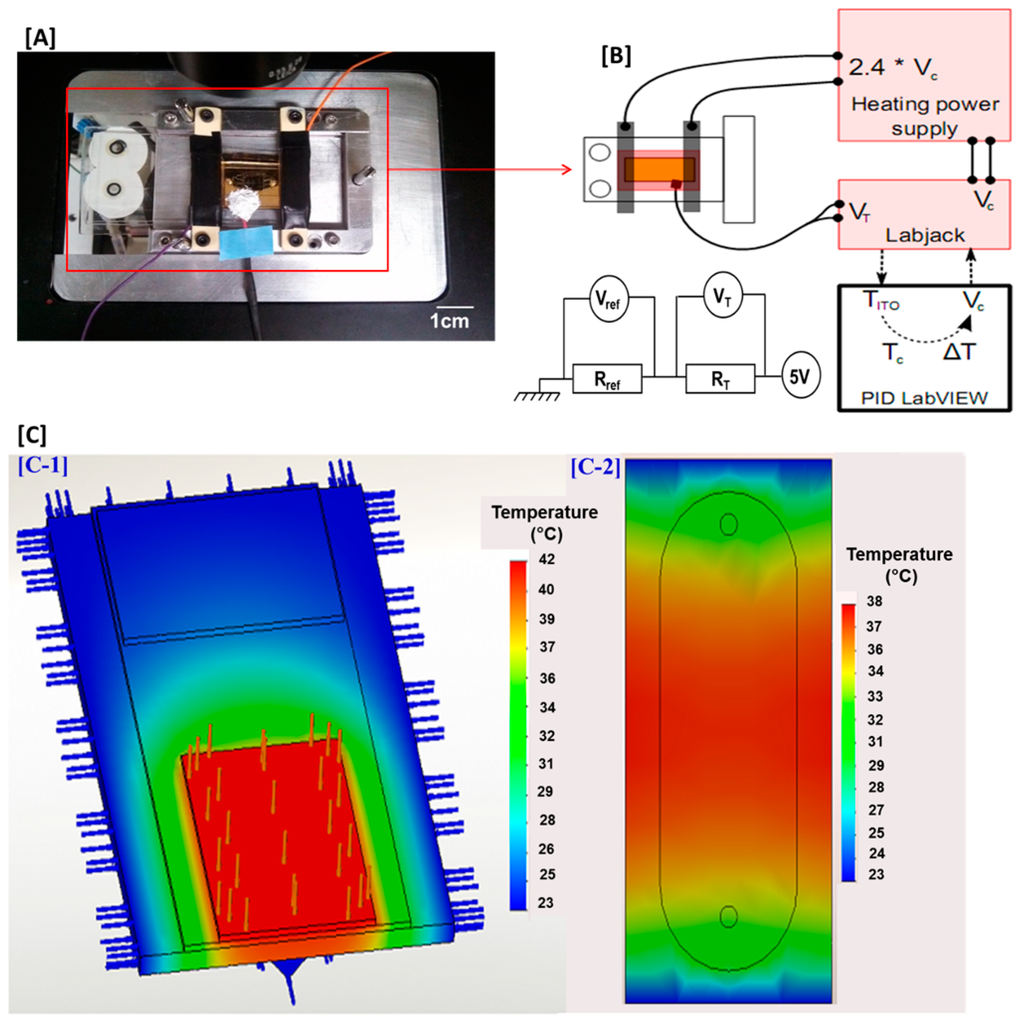 The thermal regulation device. (A) Picture of the experimental setup of the biochip and the PDMS microfluidic assembly mounted on a homemade Leica DMI4000 B microscope plate and connected to the thermal regulation device; (B) scheme of the thermal measurement and regulation system; and (C) stationary temperature field simulation performed on SolidWorks. The ITO-coated glass slide is heated-up at 42 °C to obtain a temperature of 37 °C in the microfluidic chamber. (C-1) Global view of the device; Temperature scale: 23 °C to 42 °C. (C-2) Field temperature on the biochip surface; Temperature scale: 23 °C to 38 °C.