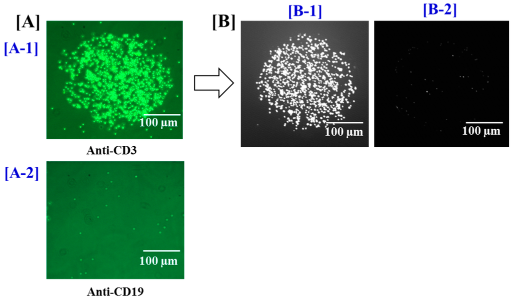 Specific capture of viable peripheral blood T lymphocytes on the chip. (A) Phase Contrast Microscopy images of antibody probes (objective 10× + Σ100× digital magnification): (A-1) T lymphocytes are specifically and stably bound on their specific antibody (anti-CD3); (A-2) there is no capture on negative control anti-CD19); and (B) fluorescence images of healthy and metabolically active captured T cells (B-1) and dead cells (B-2) after on-chip staining with cell vitality assay.