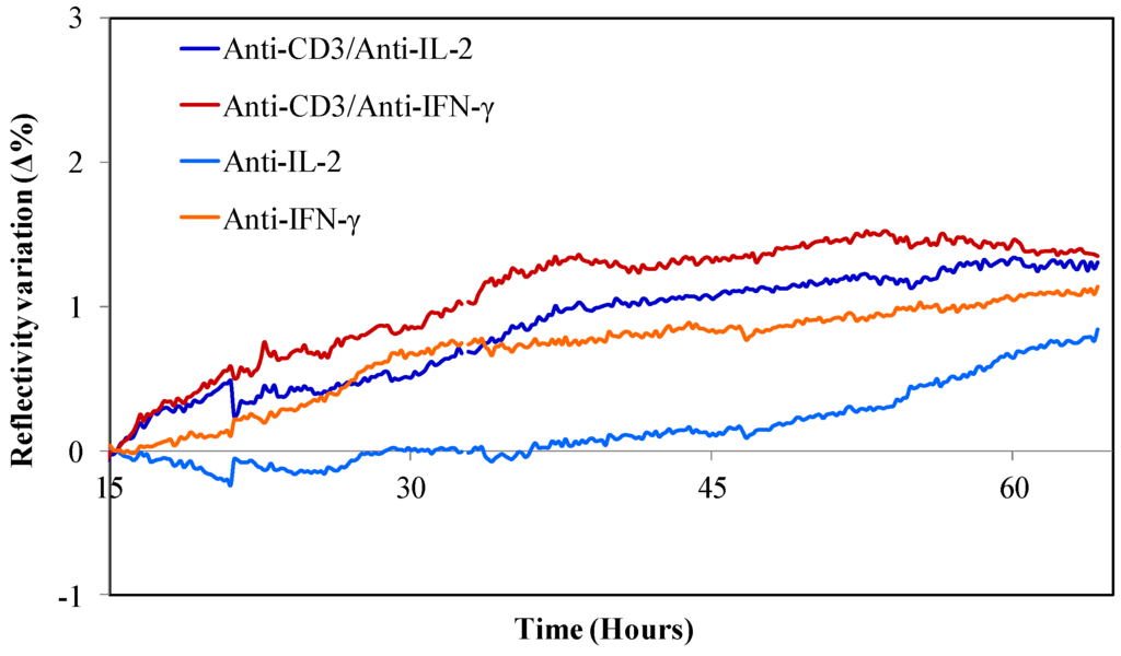 Continuous SPRi dual-detection of IFN-γ and IL-2 secreted by captured peripheral blood T lymphocytes. After cell injection in the microfluidic chamber and capture on their specific antibody probes (anti-CD3, mixture of anti-CD3/anti-IL-2, and anti-CD3/anti-IFN-γ), secreted cytokines are continuously detected by SPRi. Reflectivity variations of each probe are averaged and plotted upon time after rectification by the subtraction of the control signals (mouse IgG and/or anti-CD3 mixed with mouse IgG).