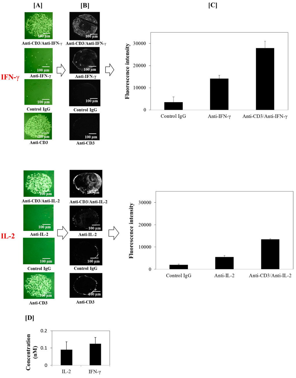 On-chip immunofluorescence detection of IFN-γ and IL-2 secreted by captured peripheral blood T lymphocytes. (A) Phase Contrast Microscopy images (objective 10× + Σ100× digital magnification) of lymphocytes which are specifically and stably bound on the specific anti-CD3 antibodies (alone or in combination with anti-IFN-γ or anti-IL-2 antibodies). There is very low or no unspecific capture of T cells on anti-IFN-γ, anti- IL-2, or mouse IgG isotypic controls; (B) fluorescence images (objective 10×, gain ×4, and exposition time 0.04 s) of secreted IFN-γ or IL-2 after detection with secondary anti-cytokine antibodies labeled with biotine and revealed by (strept)avidin-phycoerythrin; and (C) fluorescence intensities of secreted IFN-γ and IL-2 (n = 5). [D] ELISA titration of cytokines in cellular supernatants after on-chip cell culture (24-hours). After each experiment, the culture medium was recovered from the microfluidic reaction chamber (~50–80 µL) and the cytokines dissolved in the bulk medium measured by ELISA (n = 5).