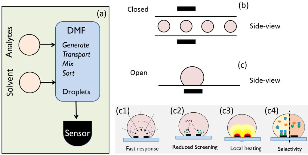 The goal of any LoC technology, eventually, is to achieve fast and highly sensitive detection of a specific analyte with the smallest possible sample/reagent volume at comparatively low cost. However, these otherwise sophisticated LoC technologies often rely on relatively simple sensors, e.g., colorimetric, rudimentary flow cytometry, UV-Vis absorbance spectroscopy, etc. [22,23,24]. In several applications, the technology, as is, has had enormous impact; for others, more sensitive sensors, that are also compatible with the architecture and topology of droplet microfluidics, are desired [5,25]. For example, real-time, rapid detection of sub-femtomolar concentration of biomolecules is critical in various areas, such as, biomedical diagnostics/therapeutics, food safety, environmental monitoring, and homeland security. The traditional sensors that achieve such high degree of sensitivity are usually too large for integration with microfluidic systems, moreover, the process technologies are often incompatible. Therefore, the recent development of droplet-based biosensors compatible with the architecture of a DMF platform has attracted considerable attention in biomedical research and applications, especially in drug screening, biomarker analysis, and on-chip chemical synthesis [5,8].