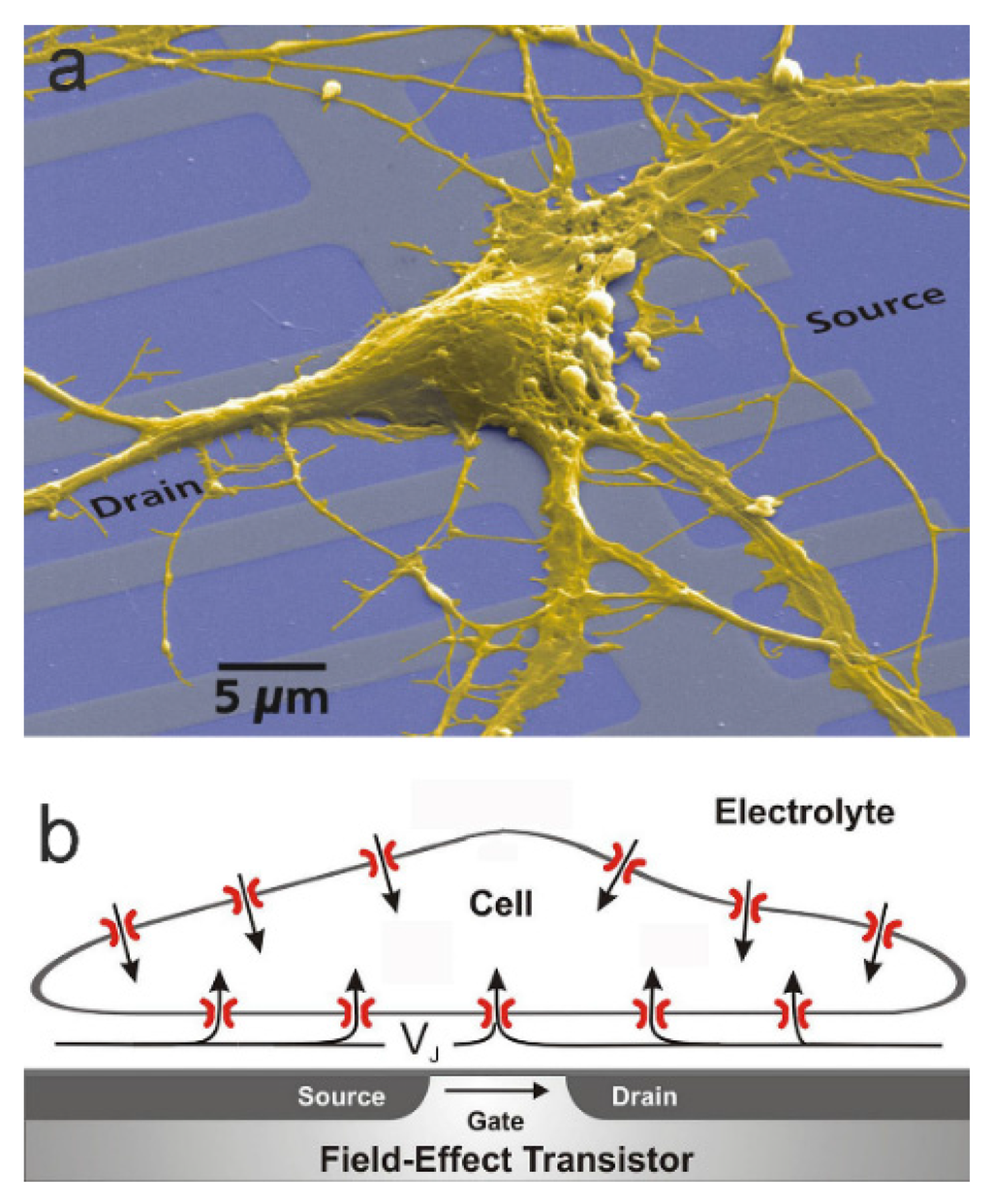 - Fromherz, P.; Offenhäusser, A.; Vetter, T.; Weis, J. A neuron-silicon junction: A Retzius cell of the leech on an insulated-gate field-effect transistor. Science 1991, 252, 1290–1293. [Google Scholar] [CrossRef] [PubMed]