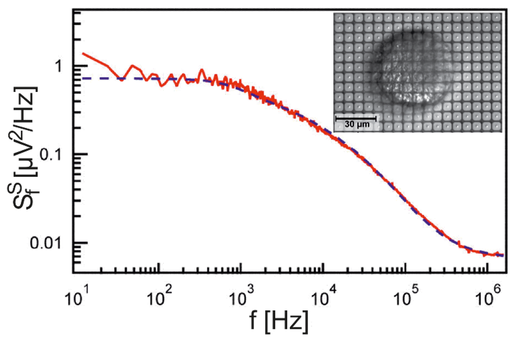 Power spectral density (PSD) of the fluctuating extracellular voltage VJ in a cell–substrate junction (by permission [26]). The PSD of a dissociated neuron from Lymnaea stagnalis is probed with an array of EOMOS transistors (insert). The logarithm of the net PSD per frequency interval for the sensor transistor in the center of the adhesion area (after subtracting the PSD without cell) is plotted versus the logarithm of the frequency (red trace). The data are fitted by the PSD of the thermal voltage fluctuations in a planar capacitive core-coat conductor with a sheet resistance rJ = 109 MΩ and a capacitance (whole cell) of cJ = 0.74 µF/cm2 (blue dashed trace).