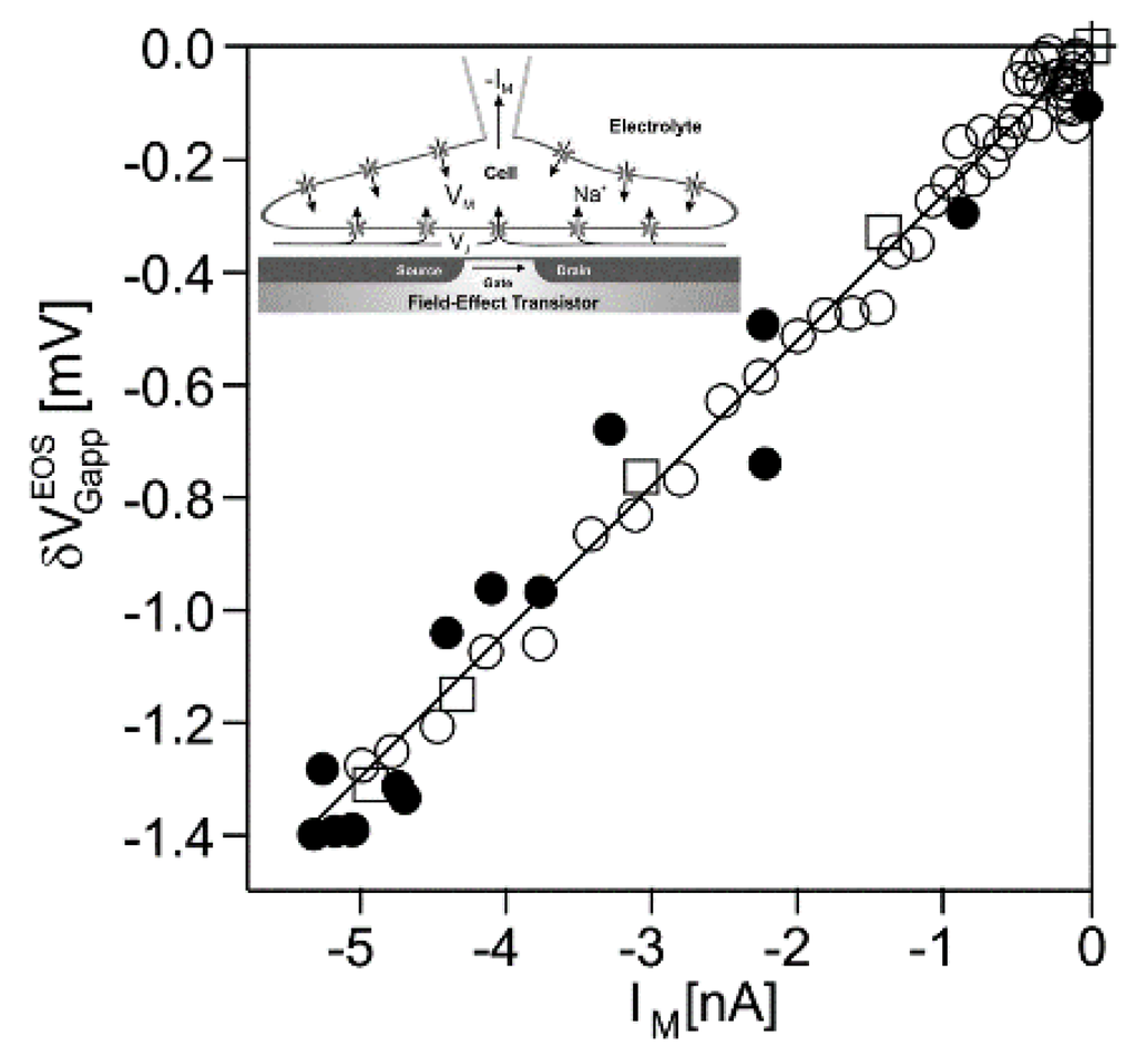 Nav1.4 channel. Transistor recordings under voltage–clamp have been reported for the sodium channel Nav1.4 in HEK293 cells at an extracellular Na concentration of 50 mM [32]. The Na conductance was activated by depolarizing steps of the intracellular voltage. The transistor response and the membrane current reflected both the typical waveform of a transient sodium current with an activation phase and an inactivation phase. The apparent change of the gate voltage is plotted in Figure 4 versus the total membrane current. There is a perfect proportionality, which is fitted with a relation . The result indicates that the transistor signal is indeed due to a pure current-induced response with . By ac stimulation and recording the response of transistor and current, a parameter has been measured. Considering Equation (27), a depleted conductance in the adherent membrane with was estimated.
