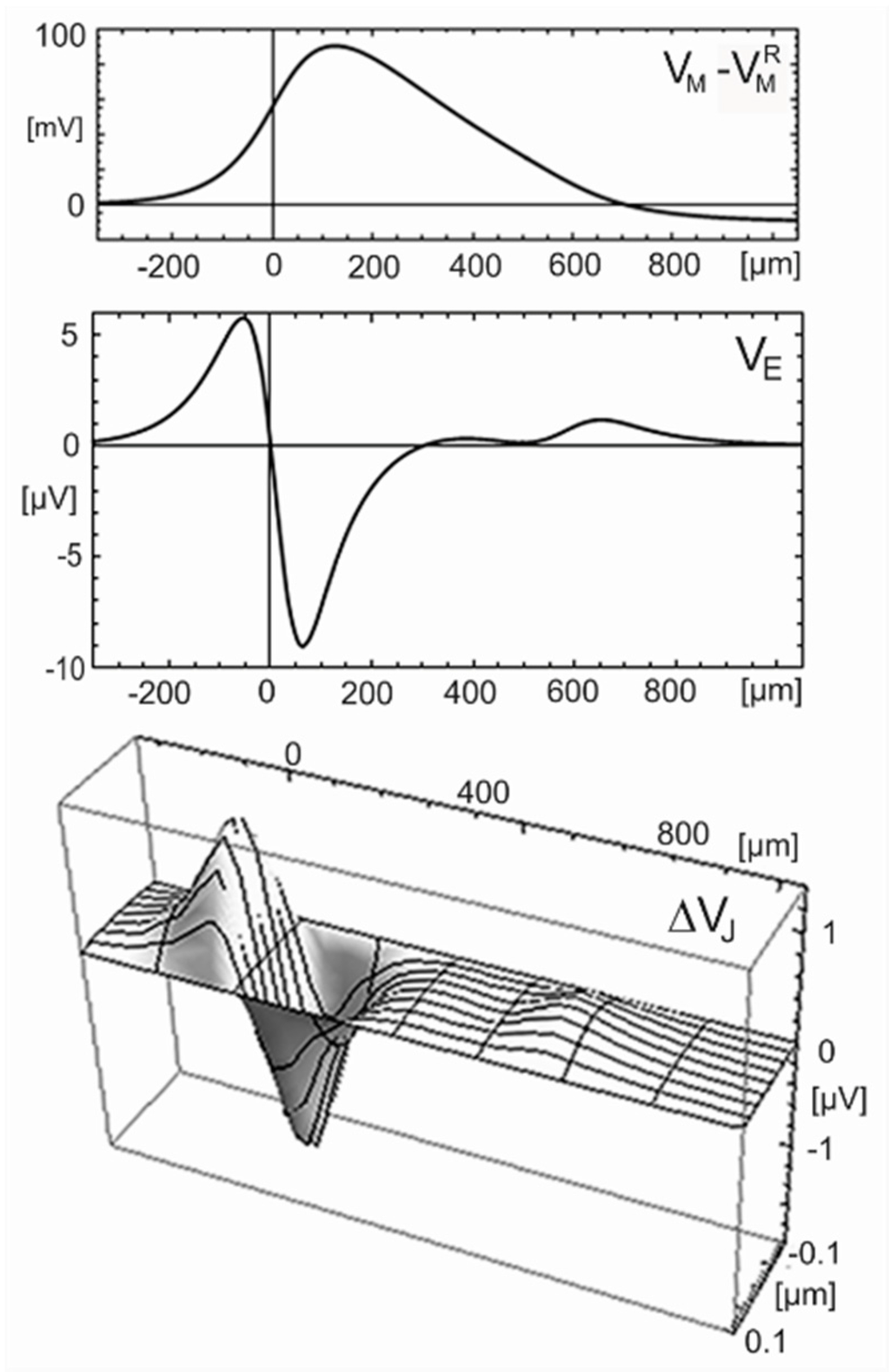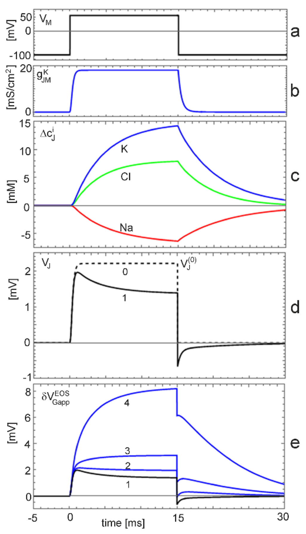 The junction voltage with changing ion concentrations is shown in Figure 5d as trace 1. Within a millisecond, it reaches almost the level of . It relaxes within several milliseconds to a stationary voltage of . This decay corresponds to the dynamics of the ion concentrations (Figure 5c). Upon repolarization, the voltage drops suddenly to a negative level and relaxes in a fast phase due to the dynamics of the ion conductance and in a slow phase due to the dynamics of the concentrations.