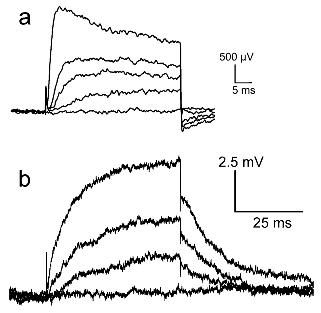 Transistor recordings of the potassium channel Kv1.3 in HEK293 cell at a constant intracellular voltage with an extracellular K concentration of 5 mM. The apparent change of the gate voltage is plotted versus time. (a) Gate oxide cleaned with an acidic detergent: depolarizations to −25, −15, −5, and +40 mV starting near the reversal voltage of potassium, repolarization after 40 ms [35]; (b) Gate oxide cleaned with an alkaline detergent: depolarizations to −20, 0, and +50 mV, repolarization after 50 ms (by permission of Springer [13]). The conditions of the experiments differ with respect to channel expression, cell size, and transistor quality. A comparison can refer only to the dynamics and the relative amplitudes of the fast and slow components.