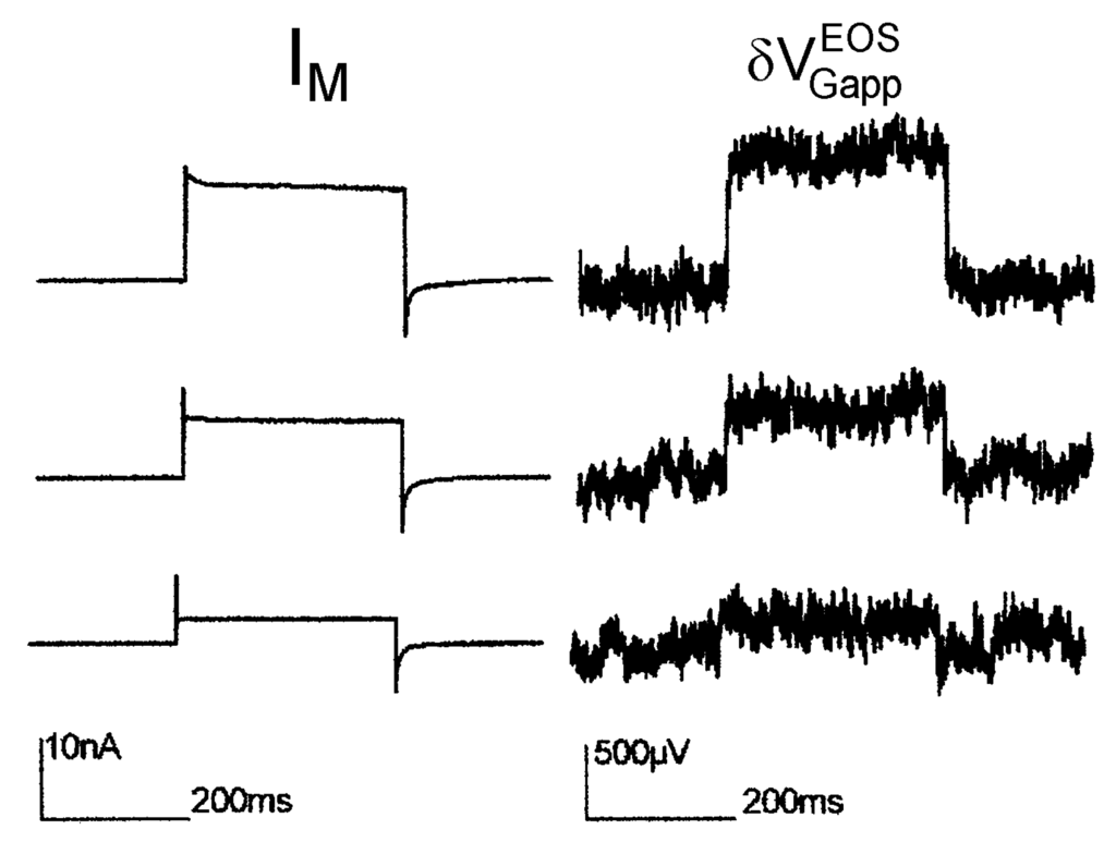 Transistor recording of Maxi-K potassium channel in HEK293 cell at a constant intracellular voltage with a high extracellular K concentration of 100 mM [34]. (Left) Total membrane current; (Right) Transistor recording. Depolarizations from −100 mV to 20, 45, and 58 mV.