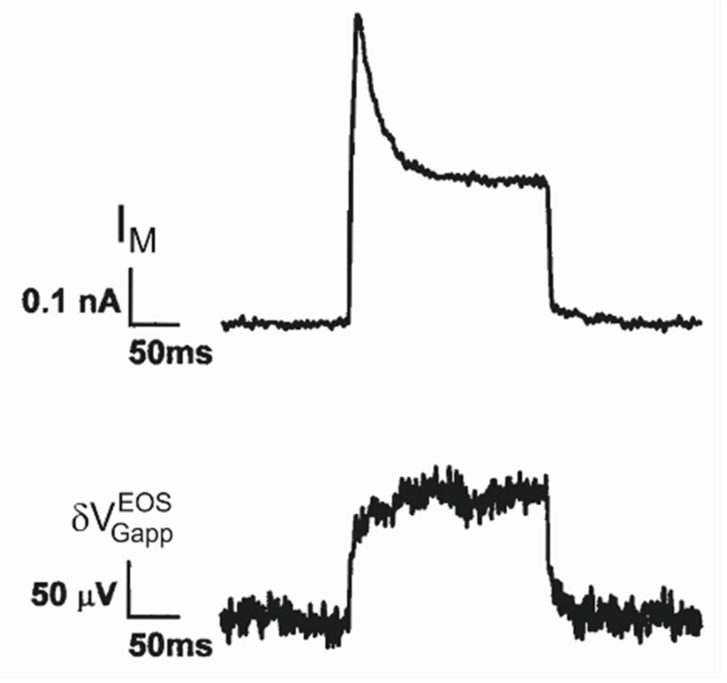 K conductance in hippocampal neurons. A first transistor recording under voltage-clamp with voltage-activated potassium conductances has been reported for cultured hippocampal neurons [33]. The membrane current and the transistor signal are plotted in Figure 8. (The chips were cleaned with a mild dish detergent). Upon depolarization the membrane current exhibits an inactivating A-type potassium conductance and a non-inactivating K-type potassium conductance. The transistor response is quite different. The apparent change of the gate voltage increases rapidly by about 80 µV and further more slowly to a stationary level of 120 µV. Upon deactivation, the voltage drops suddenly by about 80 µV with a subsequent slow relaxation. The fast and slow signal were not distinguished in [33].