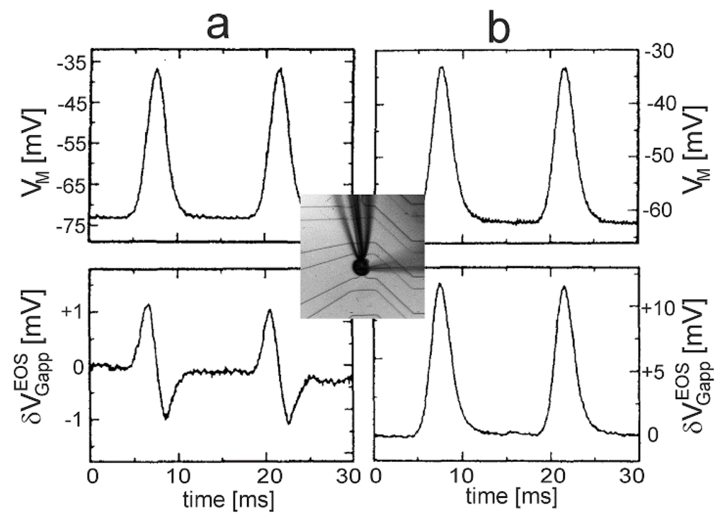 The concept of the current-induced transistor sensorics of the EOSFET with an exposed gate oxide can be applied for other potentiometric sensors, which are used for electrogenic cells to record voltage changes with respect to a reference electrode: (i) With EOMOS transistors on a CMOS chip [60], a thin metal gate is intercalated between the oxide exposed to the electrolyte and the genuine gate oxide. It is used to adjust the working point in calibration phases, but is free floating in recording phases. Every change of the electrical potential in the free electrolyte and at the oxide/electrolyte interface has the same effect as with an EOSFET; (ii) With metal electrodes on a CMOS chip [53] the exposed electrodes are in close contact (and electronically equilibrated) with the gate of a MOSFET. If a polarizable metal is used (i.e., without electronic equilibration with the electrolyte), a changing electrical potential in the free electrolyte or at the metal/electrolyte interface is projected onto the electrical potential at the surface of the gate oxide. Of course, the interface-induced signal differs from an EOSFET due to the different chemistry of the metal surface; (iii) Traditional planar electrodes [61] are electronically equilibrated with a metal wire that leads to the amplifier. For a polarizable electrode, a changing electrical potential in the electrolyte or at the interface is projected onto the wire. Perturbations of amplitude and waveform may occur due to the large separation of electrode and amplifier, and it is advisable to apply suitable calibration voltages to the reference electrode. A certain disadvantage of all arrays with uncoated electrodes is the chemically heterogeneous surface of the substrate, which can affect tissues and cultured cells.