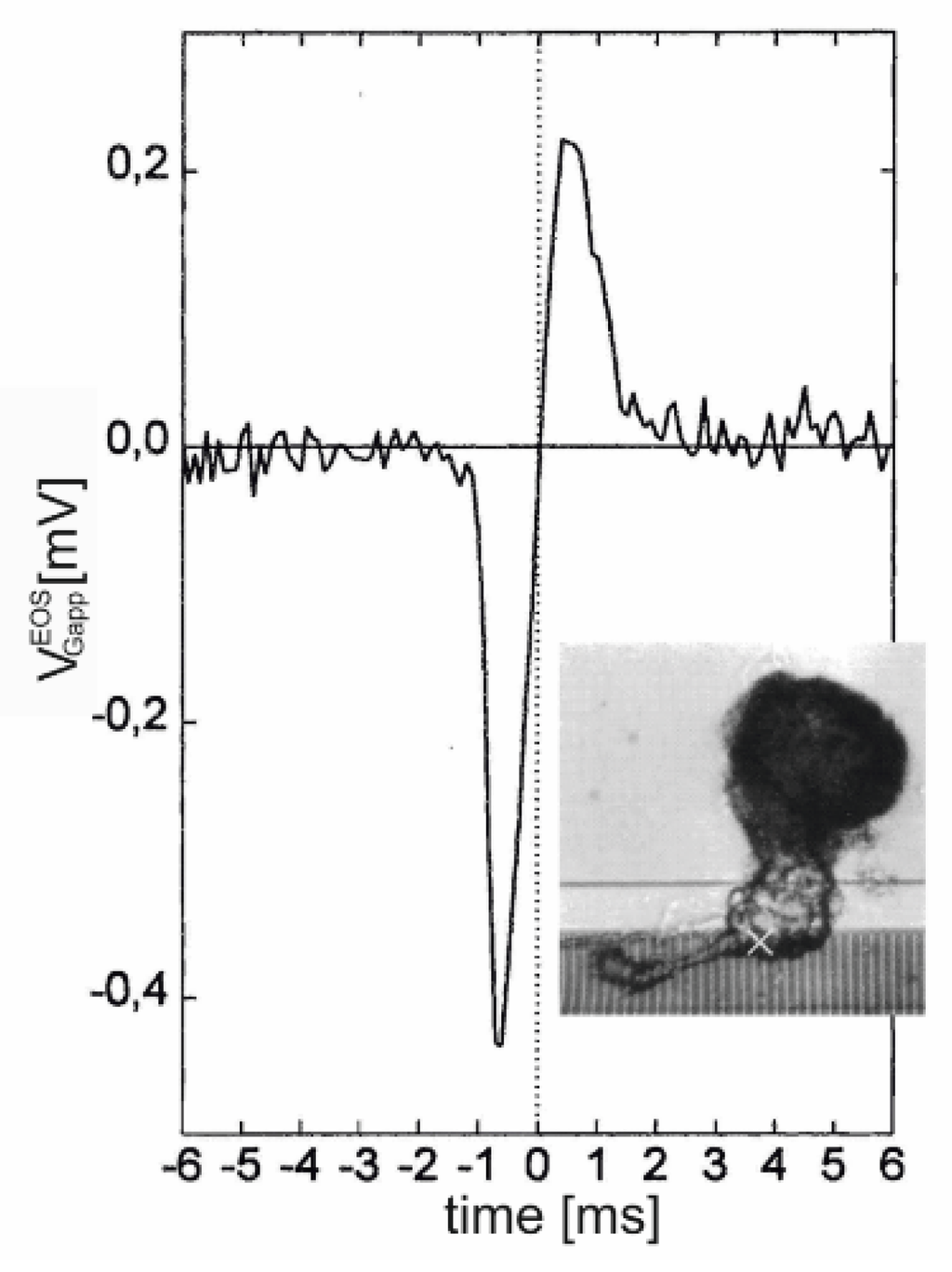 An action potential (AP) in neurons arises from the dynamics of the membrane voltage and of voltage-activated conductances. In the Hodgkin-Huxley model, the AP is an almost monophasic positive transient of the membrane voltage with a fast rise due to a Na inward current, a slower decay due to a K outward current with an inactivating Na current, and a minor negative tail [30]. Two issues must be considered when transistors are applied for extracellular recording of APs in an intact cell: (i) the dynamics of the voltage in the closed cell must be taken into account; and (ii) a local compensation of the ionic and capacitive currents in the adherent membrane must be avoided.