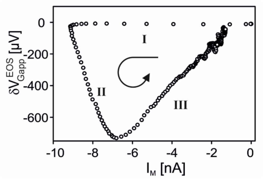 Transistor recording of the serotonin receptor 5-HT3A in a HEK293 cell for constant intracellular voltage (by permission [5]). The apparent change of the gate voltage is plotted versus the whole-cell current upon fast addition of 100 µM serotonin at an intracellular voltage of −120 mV. The time direction is indicated by the arrow (data interval 2.5 ms). The recording is obtained with a low ion sensitivity of the gate oxide. Three phases are distinguished: (I) increasing whole-cell current without transistor signal (about 20 ms); (II) decreasing whole-cell current and increasing transistor signal (about 70 ms); and (III) decreasing whole-cell current and decreasing transistor signal.