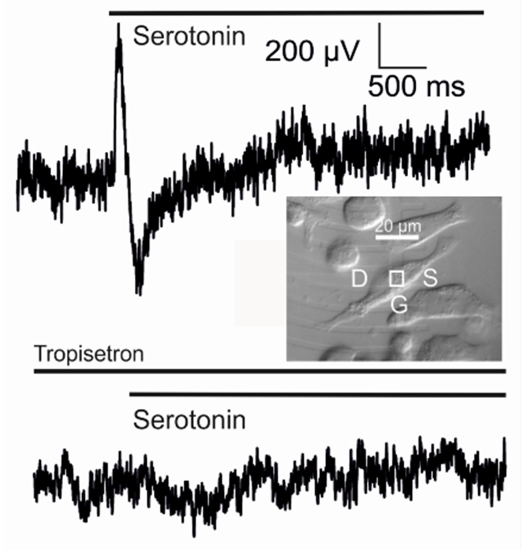 Transistor sensorics with serotonin receptor. A complete biosensor with the 5-HT3A receptor has been implemented with a supplementary Kv1.3 channel in HEK293 cells on a transistor with a low ion sensitivity of the gate [35]. A result is shown in Figure 14. When serotonin is applied, a positive transistor signal of about 600 µV appears. Within about 100 ms, it changes to a negative signal of about −450 µV, which relaxes slowly. The whole signal is abolished if the specific antagonist tropisetron is added.