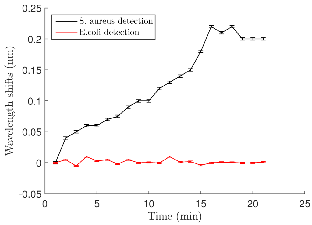 Wavelength shift vs. time after S. aureus and E. coli binding at a cell concentration of OD = 0.4 (5 × 10 CFU/mL). After 15 min, a maximum shift is obtained and is about 0.22 nm for the Staph., whereas no shift is observed for E. coli detection. Error bars are standard deviations as discussed in Section 3.2 of the text.