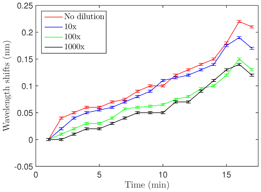 Concentration-dependence of the shift was examined by varying the concentration of the S. aureus solution used for biodetection. The OD = 0.4 solution was diluted 10, 100 and 1000 fold, and Figure 5 shows the maximum wavelength shifts for the four different concentrations (also summarized in Table 1). The 100- and 1000-fold dilutions showed almost the same wavelength shift, meaning that approximately the same number of bacteria attached to the resonator in both cases. Experiments with lower concentrations could not be carried out because of the limitations due to the relatively small quality factors of the microdisks (Q ≃ 10). Quality factors of the microdisks were measured after each functionalization step (addition of Si-PEG and LysK) and after biodetection. It is worth noting that the quality factor did not significantly change during the process and a value around 10,000 was found each time.
