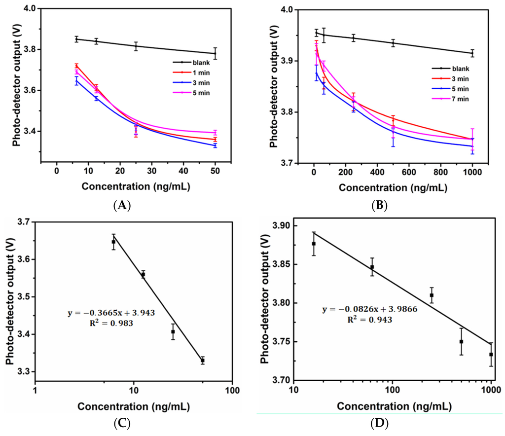 The incubation time of each individual step of the microfluidic ELISA biosensor decreased in proportion to the volumes. However, relatively long times were still needed to complete antibody-allergen binding to achieve maximum sensitivity. In addition, the time-dependence of the enzyme reaction was investigated because the light intensity captured by the photo-detector was affected by the incubation time. Figure 3A shows the response of the optical sensor to wheat (gluten) standard solutions with different reaction times. As seen in the figure, 3 min can be considered to be the saturation time based on the enzyme kinetics for the enzyme reaction under the associated volume because the outputs of 1 min and 5 min were higher than those of 3 min. Similarly, the response of the optical sensor to the Ara h 1 standard solution with different reaction times is shown in Figure 2B. Five min was considered to be the saturation time. The 3-min and 5-min curves served as the standard curves for gluten and Ara h 1 with the custom-made biosensor, respectively. As shown in the Figure 3C,D, an R2 value of 0.983 was found in linear response region between 6.25 ng/mL and 50 ng/mL for gluten and 0.943 in linear response region between 16 ng/mL and 1000 ng/mL for Ara h 1. The calculated detection limits [] of the gluten and Ara h 1 assays were 4.77 ng/mL and 15.2 ng/mL, respectively.