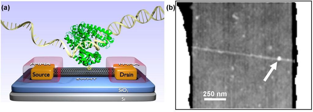 For this special issue on carbon nanotube sensing, we review the fabrication and operation of single-molecule carbon nanotube-based biosensing devices. Abundant research over the past decade has demonstrated the biosensing capabilities of carbon nanotubes, and recently this sensitivity has been extended to single-molecule electronics. Specifically, experiments have attached single enzymes to single-walled carbon nanotube field-effect transistors (SWNT-FETs, Figure 1a) and demonstrated the versatile ability of tracking an enzyme’s conformational states and revealing distributive and processed enzyme movements. The electronic nature of the FET technique has immediate benefits such as microsecond time resolution and long-duration capabilities, which are both advantages over fluorescence for studying the conformational dynamics and processivity of a single molecule. SWNT-FETs functionalized with T4 lysozyme [21,46,47], cAMP-dependent protein kinase A [48], and the Klenow Fragment of DNA Polymerase I (KF) [49,50] have all been successfully used to study each enzyme’s dynamic variability and demonstrate the capabilities of the SWNT-FET approach.