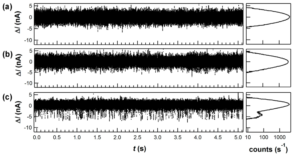 Finally, data analysis is an important part of the proper operation of these devices. One advantage of the SWNT-FET technique is its ability to continuously monitor the full reaction trajectory of a molecule over minutes, hours, or days. However, SWNT-FETs generate noise with a 1/f spectrum [67,68], meaning that long-duration measurements also exhibit large-magnitude baseline fluctuations. AC coupling or other highpass filtering successfully eliminates the lowest-frequency wanderings and emphasizes just the deviations ΔI(t) from the DC average. Figure 3a illustrates the typical noise levels after filtering, and it depicts the threshold level used to distinguish fluctuations that are attributable to KF with certainty. The filter cutoff must be chosen carefully to avoid biasing the analysis of protein activity. For example, substantial 1/f noise in the 0.1 to 10 Hz frequency band directly overlaps with the enzymatic activity of DNA polymerase, which has average turnover rates of 20 to 40 s−1 amid stochastic pauses lasting 1 s or more. The overlap of the desired signal with SWNT noise requires more sophisticated filtering techniques such as the open source analysis solutions vbFRET [69] and NoRSE [70] or, for the most challenging analyses, other nonlinear, machine learning techniques [71,72]. At present, reliable enumeration of enzyme information from long data records remains a challenging task that has only been partly automated.