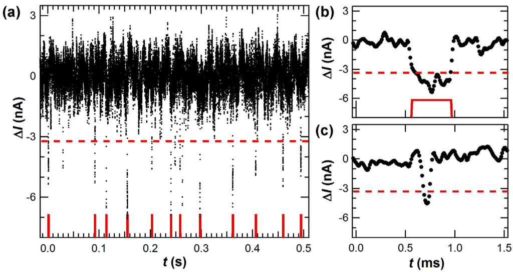 (a) ∆I(t) excursions and event enumeration (red) at higher magnification. Individual excursions were counted as dNTP incorporations if they exceeded a threshold determined by the baseline 1/f noise (dashed lines) and if their duration exceeded 100 μs (i.e., 10 data points). (b,c) Magnified plots of the first two ∆I(t) excursions in (a) demonstrate examples of: (b) a base incorporation event; and (c) an excursion rejected for having a short, unresolved duration. A 40 μs amplifier rise time limited analysis to the longer events, but better time resolution might reliably identify brief ∆I(t) excursions caused by noncatalytic KF motions.