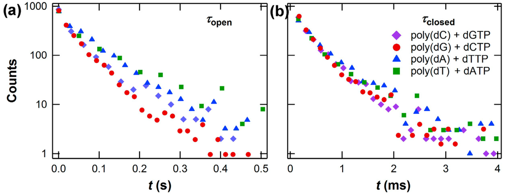 Example distributions of (a) τopen and (b) τclosed acquired for all four native nucleotides using a single KF molecule. The different slopes for τopen represent different average processing rates for the four nucleotides. The portion of the cycle represented by τclosed, in which catalytic incorporation of the nucleotide occurs, is insensitive to the nucleotide species. The exact value of <τopen> varies from one molecule to another and can be 50% to 300% of the values shown here. However, each different copy of KF follows the trends shown here.