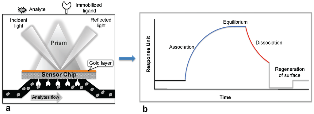 Surface plasmon resonance (SPR) biosensing platform: (a) SPR biosensing system; (b) Sensogram response observed upon the ligand interaction with the immobilized biomolecule.
