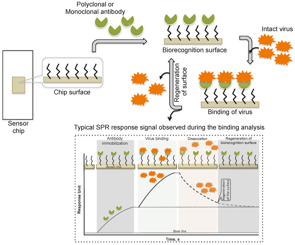 Schofield and Dimmock [] immobilized a monoclonal antibody via an amine-coupling reaction on the sensor chip (CM-5, which is coated with a carboxylated dextran polymer matrix). This monoclonal antibody (HC10) specifically recognizes the hemagglutinin (HA) derived from an influenza virus (A/fowl plague/Rostock/34 (H7N1)). The purified virus (A/fowl plague/Rostock/34 (H7N1)) was injected over the surface of the monoclonal antibody, and the response of the bound virus was observed (456 ± 21 RU). Interestingly, after the analysis, the monoclonal antibody surface could be regenerated by the injection of 0.1 M ammonium hydroxide solution, which stripped the bound virus. This procedure allows multiple analyses using the same monoclonal antibody surface without sacrificing the affinity towards the HA of A/fowl plague/Rostock/34 virus. The typical SPR analyses, steps, and output plot are summarized in Figure 2. Indeed, this work was the first demonstration that an entire viral particle with a size of approximately 120 nm could be analyzed through its interactions with monoclonal antibodies. Most viruses are smaller than the current limit for SPR measurements (approximately 300 nm); thus, it is possible that many plant and animal viruses can be analyzed. With these developments, for the past two decades, a few viruses have been detected using the protocol described above, the SPR platform [,,,,,,], with some modifications, and these viruses are cataloged in Table 1.