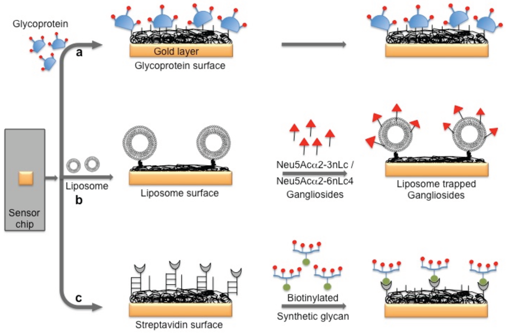 A schematic representation of the preparation of three possible glycan biorecognition surfaces on the SPR platform: (a) Glycoproteins as biorecognition surface; (b) Natural glycans as biorecognition surface; and (c) Synthetic glycans as biorecognition surface.