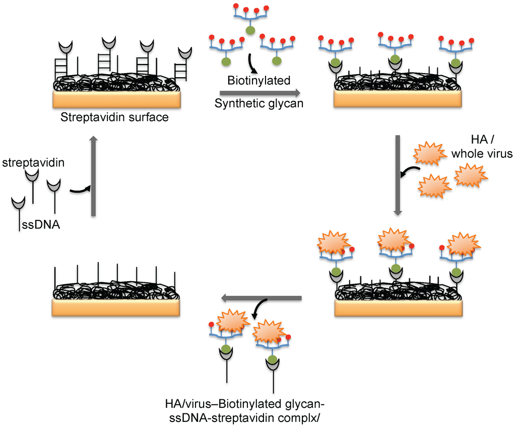 The hemagglutinin (HA) protein of influenza virus binds specifically to the complex glycans on the host cell surface through a terminal sialic acid (Sia) with α2-3 and α2-6 linkages. Interestingly, the HA of avian influenza virus binds specifically to α2-3 Sia, which is preferentially expressed in the intestinal tracts of waterfowl. In contrast, human-adapted influenza virus binds specifically to α2-6 Sia, which is abundantly expressed in the epithelial cells of the human upper respiratory tract []. Human influenza virus (Human A/Aichi/2/6,8 (H3N2)) and avian influenza virus (Avian A/Duck/Hong Kong/313/4/78 (H5N3)) were evaluated for their glycan preferences using liposomes that incorporated gangliosides (Neu5Acα2-3nLc4 and Neu5Acα2-6nLc4) as the biorecognition surface in the SPR platform [] (Figure 4b). Their analyses suggested remarkable differences in the binding kinetics of the two influenza viruses to the Neu5Acα2-3nLc4Cer and Neu5Acα2-6nLc4Cer gangliosides. For an alternative to the above two strategies, we previously explored synthetic glycans as a biorecognition surface for evaluating HA binding; the glycans were derived from either avian influenza viruses or human influenza viruses, and they could also be used for flu surveillance with the SPR platform [,,] (Figure 4c). For screening to identify an appropriate glycan that can recognize HA with high efficiency, the three-dimensional structure of HA should be considered. The HA structure revealed that the HA is a homotrimer that possesses three glycan binding sites, which were estimated to be approximately 5 nm apart. One synthetic glycan tested in our study was a biotinylated tetravalent glycan that had four Sia glycan moieties at the distal end, and our building model suggested that the distance between the Sia glycans moieties was approximately 4 nm. Thus, the biotinylated tetravalent glycan would monovalently bind to HA but would capture other HA trimer using the three remaining Sia glycan moieties. For simplification of the analysis of the HA–glycan interactions, for multiple samples, and for a simple way to regenerate the biorecognition surface, we adopted a Biotin-CAP chip (Biacore), as shown in Figure 5. Using two synthetic glycan surfaces, (Neu5Acα2-3 Galβ1-4GlcNAcβ1-polyacrylamide (PAA)-biotin) and (Neu5Acα2-6 Galβ1-4GlcNAcβ1-PAA-biotin), HA derived from both avian and human influenza viruses were evaluated efficiently [,]. Recently, a glycan-based impedimetric biosensor was used to detect an influenza virus (H3N2). This biosensor was able to efficiently detect the viral particles (13 particles/μL) []. Although the glycan surface is an alternative to the antibody surface for biorecognition, the viral surface protein requires a glycan-binding site and must be recognized with high affinity and thus, the strategy is limited to few viruses, which meet such requirements.
