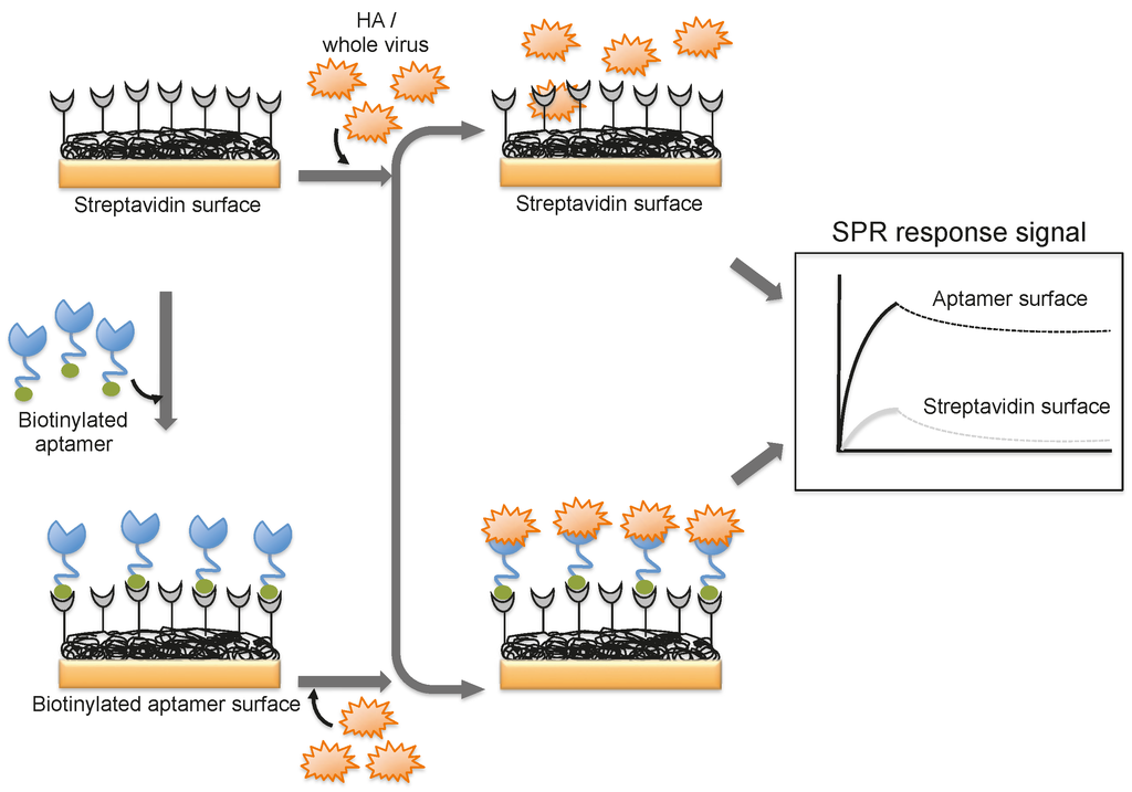 A DNA aptamer selected against the HA of avian influenza virus (A/Vietnam/1203/04) binds efficiently with an equilibrium dissociation constant of 4.6 nM []. Moreover, the aptamer showed specificity for binding to the HA derived from A/Vietnam/1203/04 and discriminated against all other HAs derived from other strains of H5N1 and also other subtypes of influenza A viruses []. The selected aptamer was then adopted for a biorecognition surface in SPR platform for the detection and evaluation of specific avian flu viruses (Figure 6). From the analyses, the concentration of avian influenza virus titers was quantitatively estimated to be in the range of 0.128–1.28 hemagglutination unit (HAU, is set as the minimum amount of HA or HA expressing virus required to cause agglutination of red blood cells and the titer of the virus solution, expressed as hemagglutination units per milliliters (HA Units/mL)), whereas the non-target influenza viruses (H1N1 (A/WileyLab/87), H2N2 (A/PA/chicken/1117-6/04), H5N2 (A/PA/chicken/85), H5N9 (A/WileyLab/85), H7N2 (A/PA/chicken/3779-2/97), H9N2 (A/WileyLab/87)) elicited an insignificant response signal []. Furthermore, poultry swab samples containing A/Vietnam/1203/04 virus titers were estimated efficiently, with a complete analysis in less than 1.5 h, which is shorter than the time for conventional methods of virus detection []. Although these studies suggest that whole viruses can be monitored by SPR, these approaches are limited to either a single or only a few samples because the sensor surface cannot be easily regenerated for the next round of analyses. To adopt the SPR platform for multiple sample analyses, it is important to employ suitable sequester reagents that allow simple regeneration procedures that restore the efficiency of the sensor without damaging the overall efficiency of the sensor chip.
