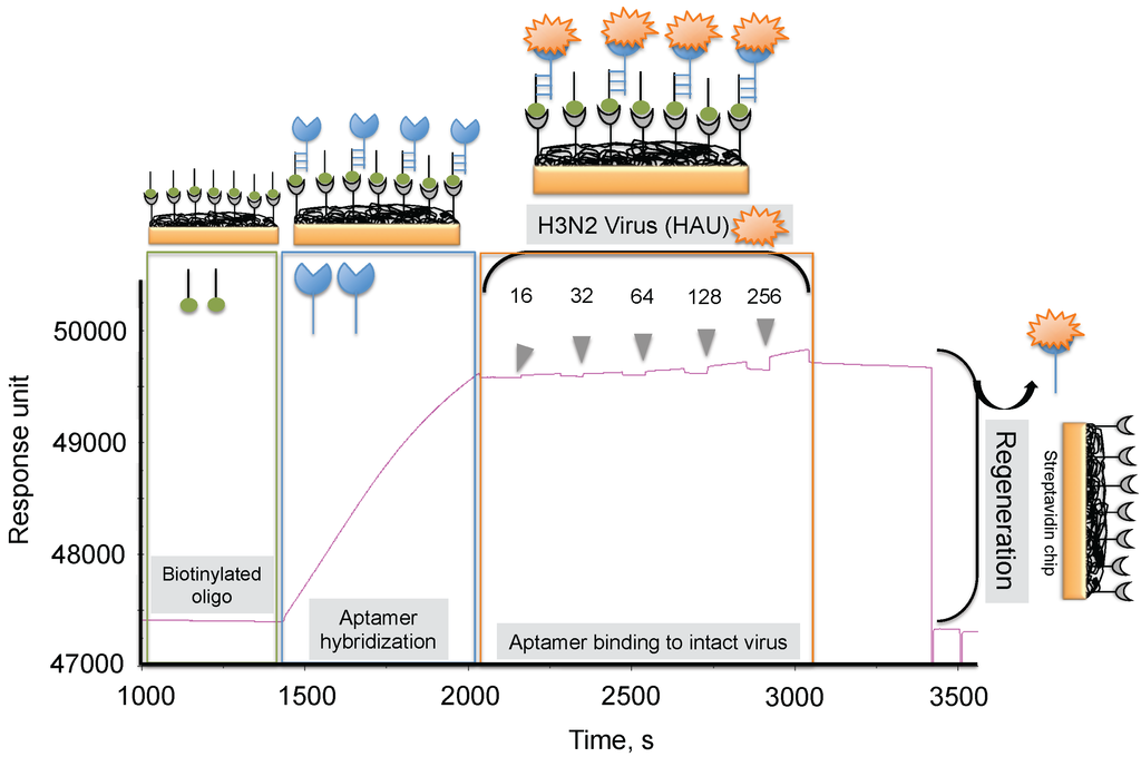 To progress in this direction, we reported an alternative methodology, which allowed us to regenerate the biorecognition surface of the sensor to analyze multiple samples. In this method, streptavidin (SA) was immobilized on the CM5 chip by an amine-coupling reaction followed by a biotinylated dT(24) oligo binding on the streptavidin surface of the chip. Our selected anti-H3N2 aptamer allowed hybridization to the oligo dT, which was extended by an A(24) residue tail at the 3’ end (schematic diagram shown in Figure 7) []. Over this surface, different amounts (16, 32, 64, 128, and 256 HAU) of A/Panama/2007/1999 (H3N2) virus were injected. A representative binding analysis of the entire cycle, including the immobilization of the aptamer, the virus binding analyses (single-cycle kinetics), and the regeneration step, is shown in Figure 7 []. All of the obtained response signals for different amounts (HAU) of virus were corrected by subtracting the responses of a control flow cell (where a complementary aptamer was immobilized) from the responses of an aptamer-containing flow cell. The response observed in the control flow cell was significantly lower than the aptamer cell responses during the above analyses. The observed response signals were plotted against each HAU for the influenza virus, showing a linear response with increasing HAU. The same chip was repeatedly used for >90 cycles. We believe that the response signal in the above studies could be improved further by considering a shorter length of the dextran matrix or other self-assembled monolayers (SAM). To test whether the response signal improved for a shorter length of dextran or SAM, we used a CM3 chip (which has approximately one-third of the thickness of the CM5 Biacore chip) and also prepared different SAMs (approximately 10 mm thickness) on a gold surface chip []. Using these chips, we repeated the analyses after immobilizing the SA, biotinylated oligo, and the aptamer, (as described above) with different amounts (HAU) of influenza virus. Our analyses found that both signal and the sensitivity improved on the chips when dextrans or SAM with a shorter chain length were employed []. Taken together, our analyses suggest that SAMs with a shorter chain length are preferable for analyzing intact viruses, even in the case of influenza virus, which is approximately 120 nm.