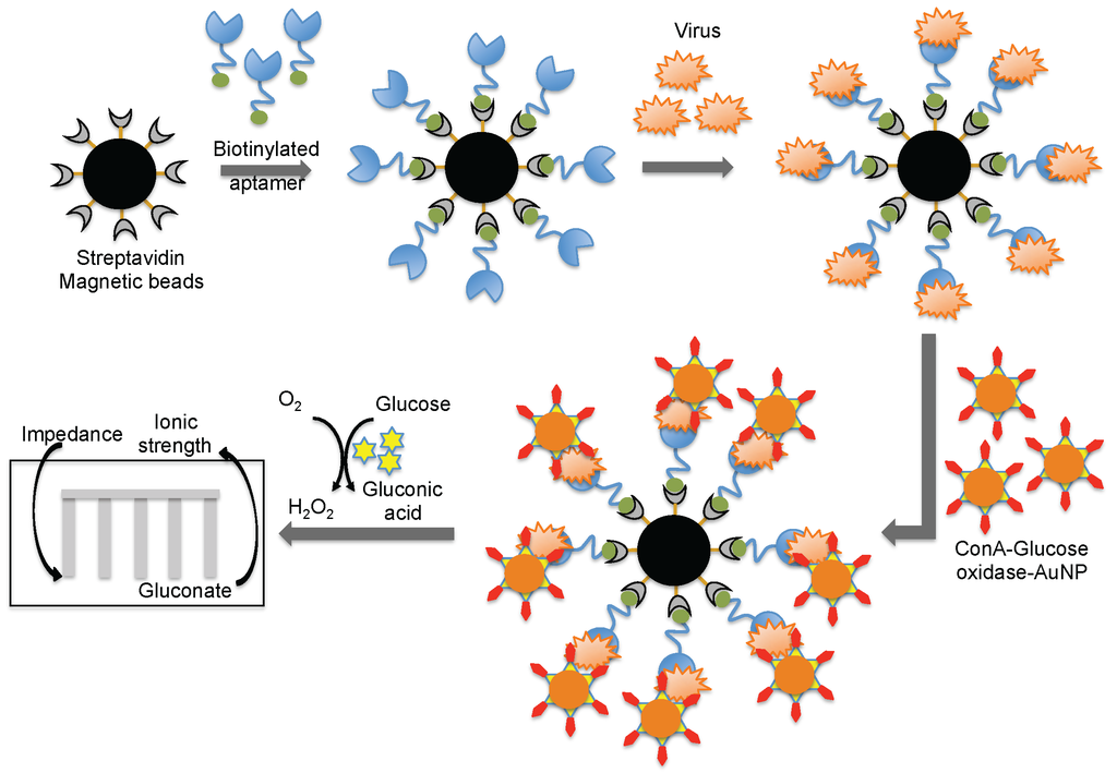 Wang et al. [] combined both aptamer and glycan surfaces in an impedance biosensor for the direct detection of an intact virus. In this technique, a specific aptamer against the avian influenza virus (H5N1) that was developed previously [] was captured on streptavidin-coated magnetic beads. When an avian influenza virus was present in the test sample, the aptamer was captured on the magnetic bead. Once the influenza was captured, a complex containing concanavalin A (ConA)–glucose oxidase immobilized on the 20 nm gold nanoparticle bound to the virus through the glycans of concanavalin A. The entire captured complex (aptamer–virus–ConA–glucose oxidase–gold particle) was transferred to an aqueous glucose solution to activate an enzymatic reaction to yield gluconic acid. The production of gluconic acid increased the ionic strength of the solution, which in turn decreased the impedance on a screen-printed interdigitated array electrode (Figure 8) []. Compared to biosensors using either antibodies or aptamers alone, the above described biosensor displayed better sensitivity (8 × 10−4 HAU/200 μL) []. A quartz crystal microbalance (QCM) based on the aptamer was also reported using the same aptamer that specifically binds to the avian influenza virus []. The QCM-based aptamer sensor detection limit for influenza was 0.0128 (HAU), and the analyses required approximately 30 min.