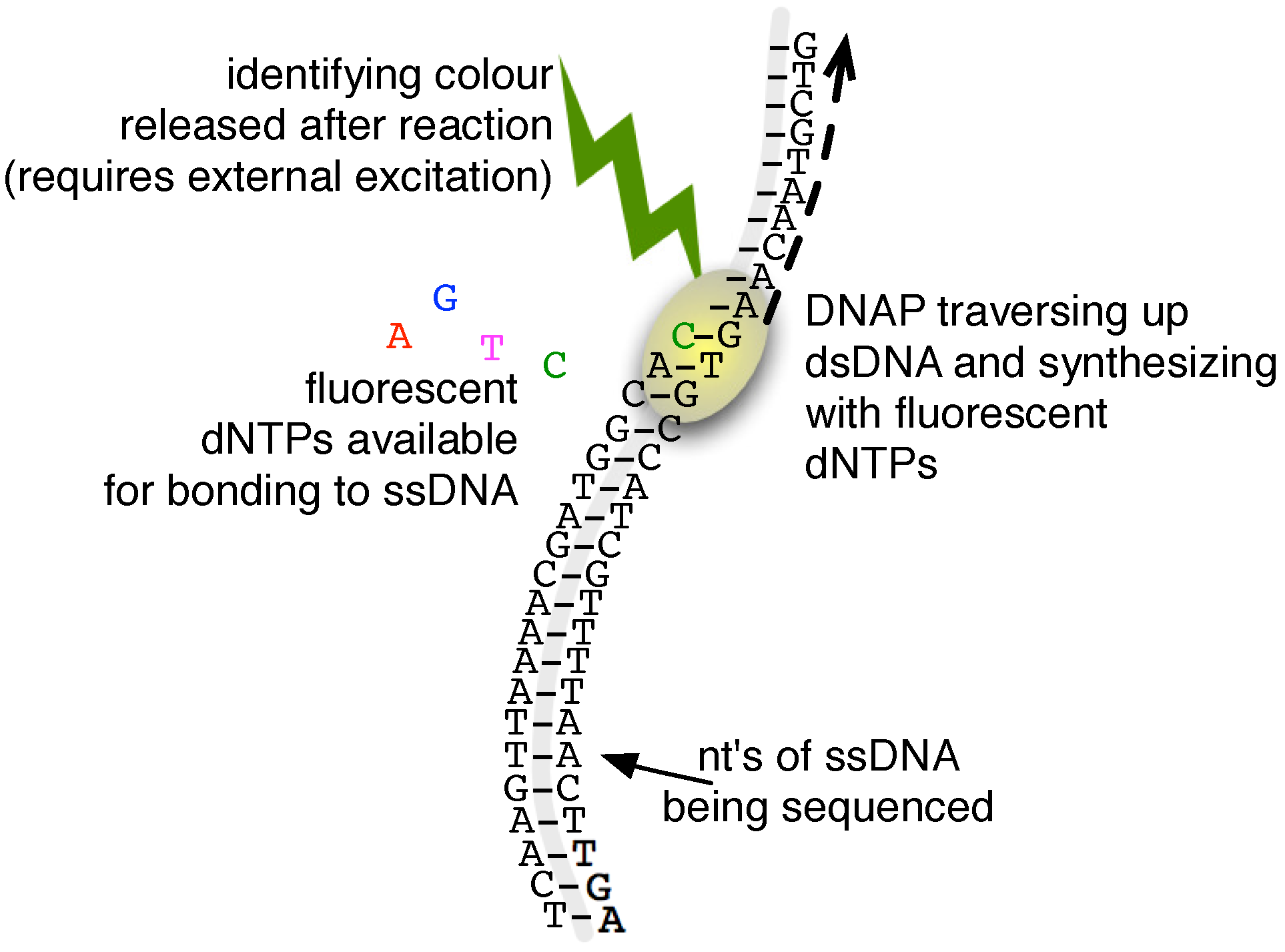 As with optical NGS schemes, the PacBio system has its DNAP attach fluor-tagged nucleotides to a ssDNA template (see Figure 3). Because of the ZMW, however, such an incorporation can be sensed, in real-time, by exciting the ZMW with a laser and recording the colour of the reflected light. A stimulated emission signal is sensed as soon as a labelled dNTP is sampled by the DNAP and, for matching samples, continues during the process of incorporation onto the template. Since the fluor tags are linked to the terminal phosphate moiety, the reflected signal ceases and, therefore, terminates the single-molecule signature, once the DNAP cleaves the phosphate group (causing the fluor to diffuse out of the focus region), a by-product of its extension mechanism.