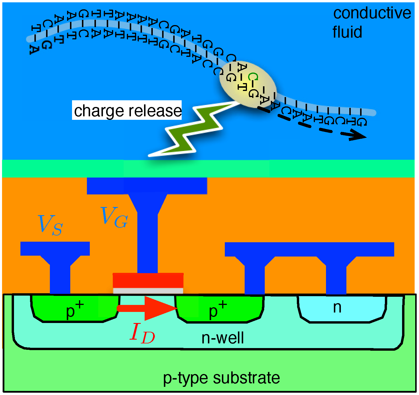 A simplified example of this IT’s charge-sensing apparatus is shown in Figure 2. As portrayed, a p-channel metal-oxide-semiconductor (PMOS) transistor immersed in a bath of conductive fluid is used to conduct a given current under a given gate bias, . The reaction incurred due to the binding between a single-sided strand of DNA and a complementary nucleotide releases positive charges (hydrogen ions) that bind to a sensitive area above the PMOS and thus vary its threshold voltage V-th. As a result, the transistor’s source voltage is changed in relation to the released charge, thus achieving a pH sensor.