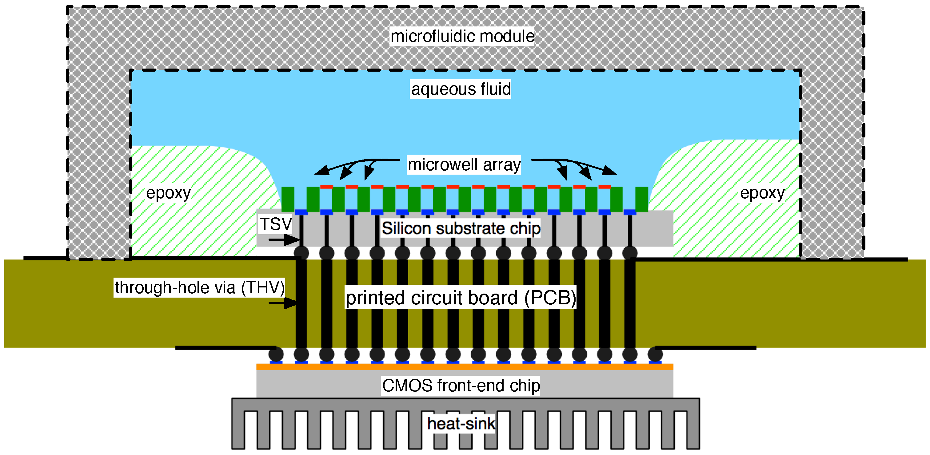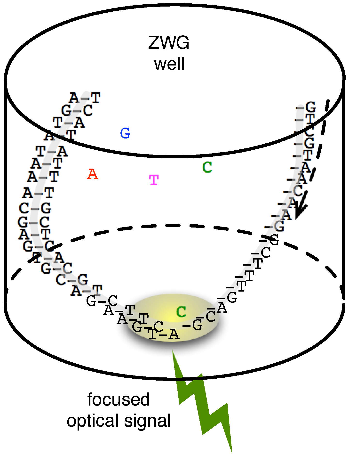 Nanopore-based sequencers are one embodiment of this vision, and we detail them and their interface to CMOS technologies below. In the spirit of establishing a broader context, however, we first outline its contemporary on the single-molecule sequencing front, Pacific Bioscience’s (PacBio) focused optical detection system [23]. In this technology, a nanoscale well (100-nm in diameter) with a special coating has a modified DNAP adhered to its bottom. The minuscule well structure achieves accurate focusing of light, a zero-mode waveguide (ZMW), capable of directing light originating from close proximity to the DNAP to an optical detection system [24].