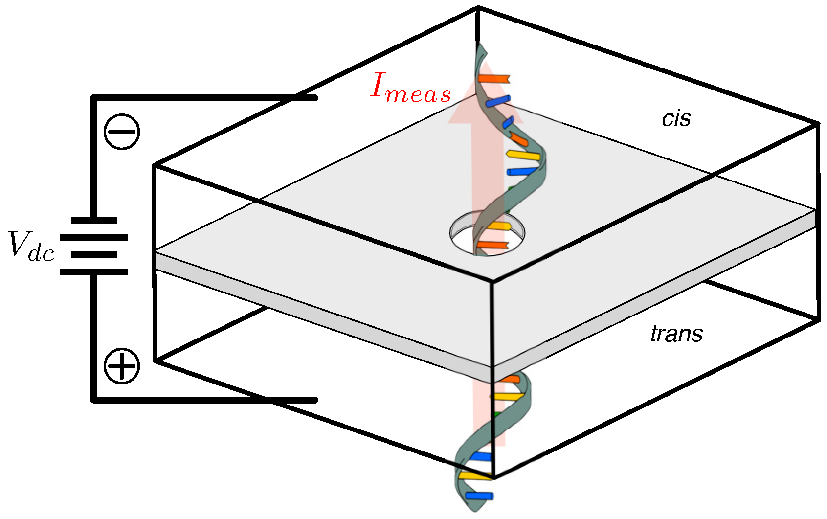 Oblique view of simplified nanopore structure. A thin, pore-infused, membrane separates the cis and trans chambers biased with DC voltage .