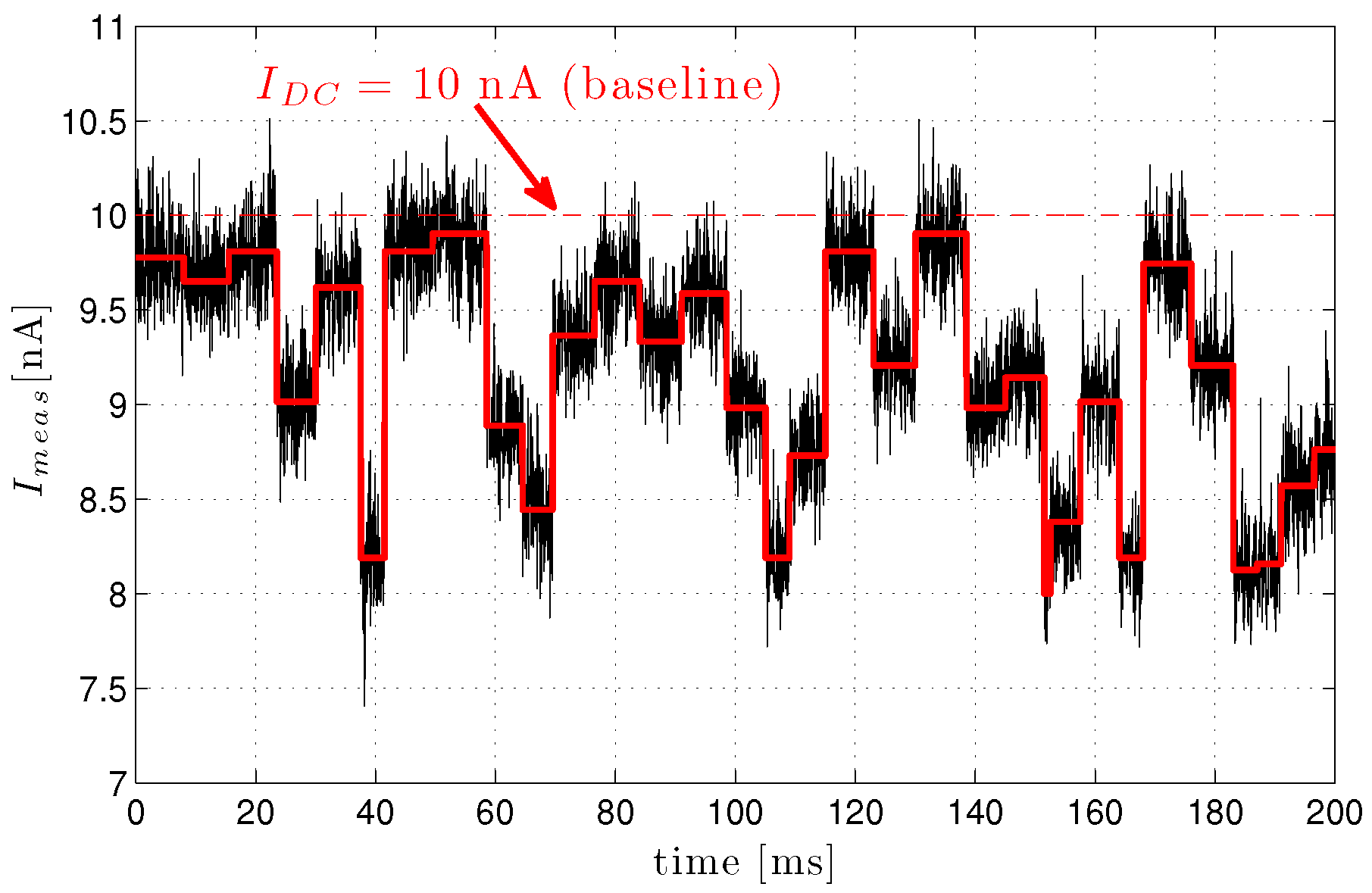 Applying a potential across this apparatus causes the fluid’s ions to flow through the hole from one channel to the other, thus establishing a DC baseline current, . As illustrated in Figure 5, introducing analyte particles into say the cis bath and allowing them to traverse (i.e., translocate through) the hole by any of a number of mechanisms (e.g., electrostatic, pressure/concentration gradient, mechanical, etc.) results in intermittent blockage of the opening, a resultant drop in conductivity and, hence, a modulation of the baseline current whenever a particle translocates the opening. Ideally, a piecewise-constant measured current response as outlined in red in Figure 5 may be anticipated; this is a result of discrete molecular features imposing characteristic blockage. At the very least however, the noise of the test apparatus (black curve in Figure 5) can be expected to corrupt this, resulting in a stochastic measured current, , the handling of which imposes a significant signal processing challenge.