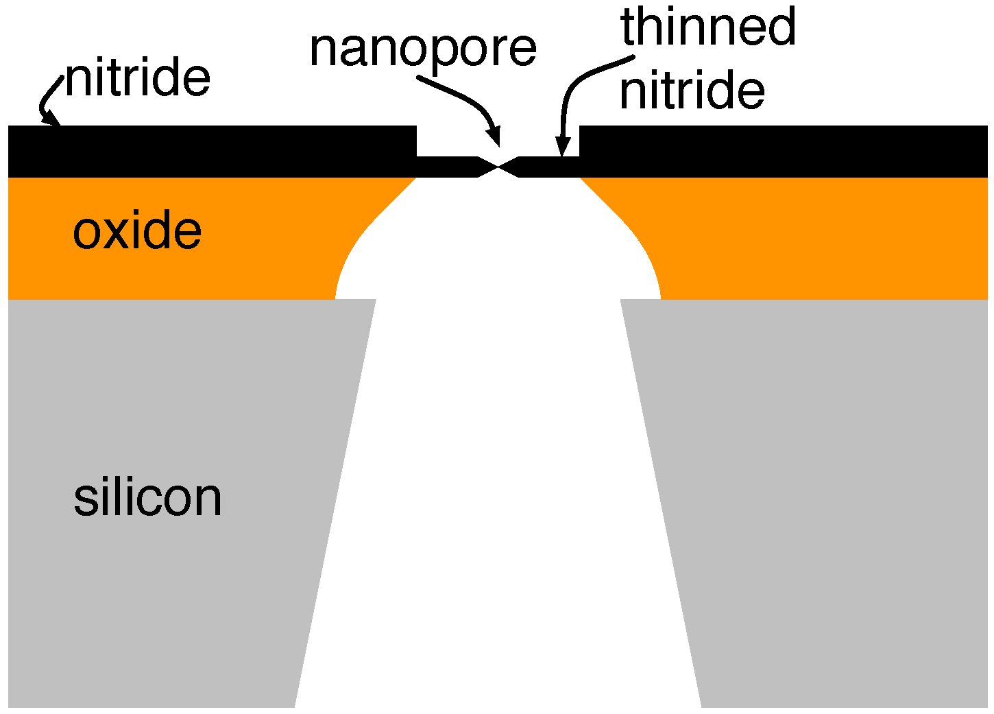 Cross-section of a typical solid-state nanopore and its support structure.