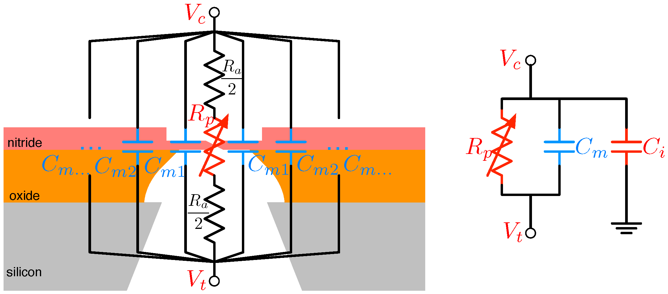 The more intricate structure of SSNs provides for more capacitive contributors [63], but arguably the most important of these is the portion of nitride material exposed to the chemical bath on both sides. This layer, roughly 50-nm thick, possesses a capacitance of roughly 1.2 fF/ [63], smaller than the 10 fF/ of the thinned nitride layer, but typically distributed over a much larger area.