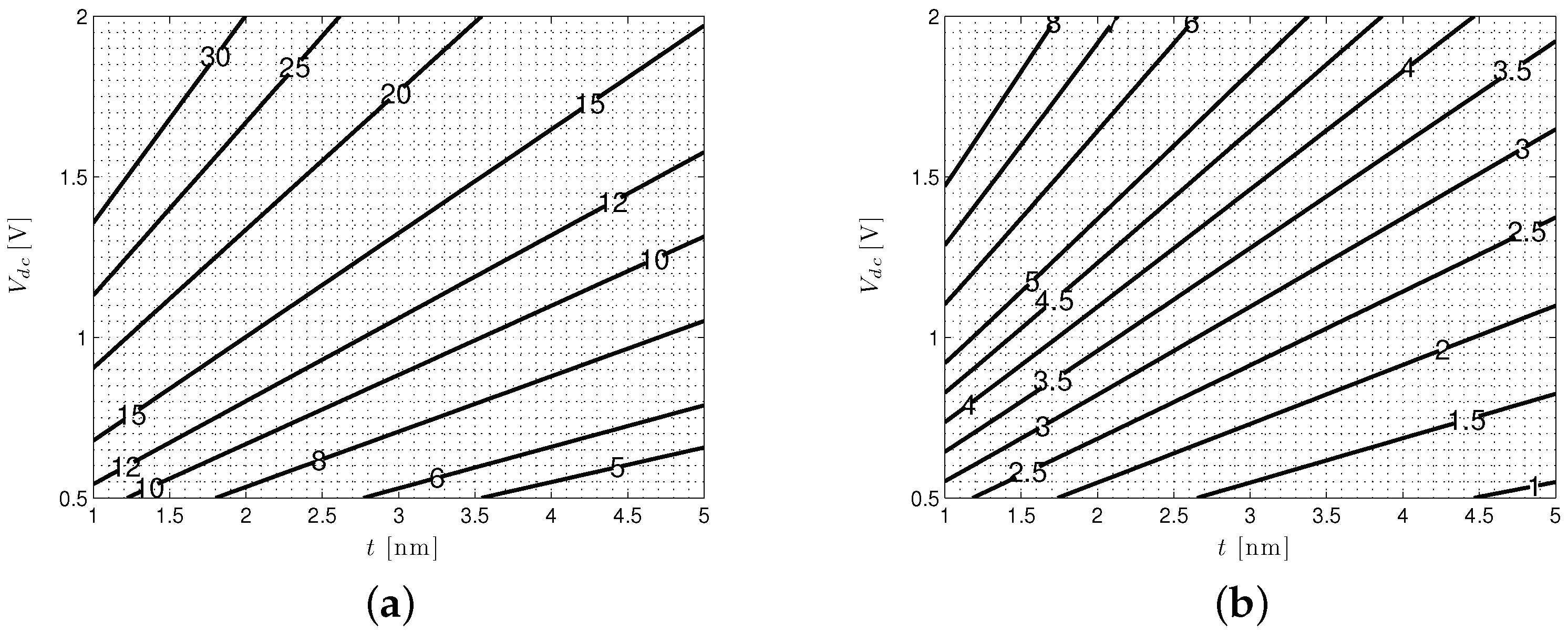 Solid-state nanopore (SSN) ( nm) and as a function of pore bias () and thickness (t). (a) Contour plot of the (in nA) as a function of nanopore thickness, t, and applied DC bias, ; (b) contour plot of the (in nA) as a function of nanopore thickness, t, and applied DC bias, .