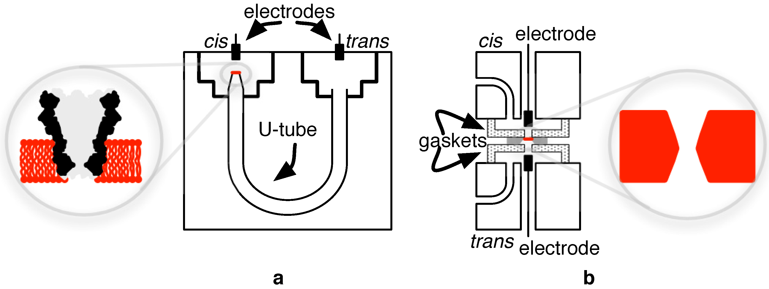 Of course, the more immediate problem to appropriating the Coulter method for the quantification of DNA is to find a means of shrinking its critical feature, the hole through which comparably-sized DNA analytes are filtered (the eponymous nanopore) is needed. Namely, without a sufficient match between particle size and channel diameter, the realizable modulations are too weak to be accurately detected due to the aforementioned noise issue. In the mid-1990s, a means of achieving a workable nanosensor was forwarded, propelled by the insight that naturally-occurring protein orifices (porins) could suffice [28,29,30]. Infusing such biological nanopore structures in a lipid bilayer membrane to serve as a pore support and as a boundary between cis and trans has been common in published reports as reviewed in [31,32,33].