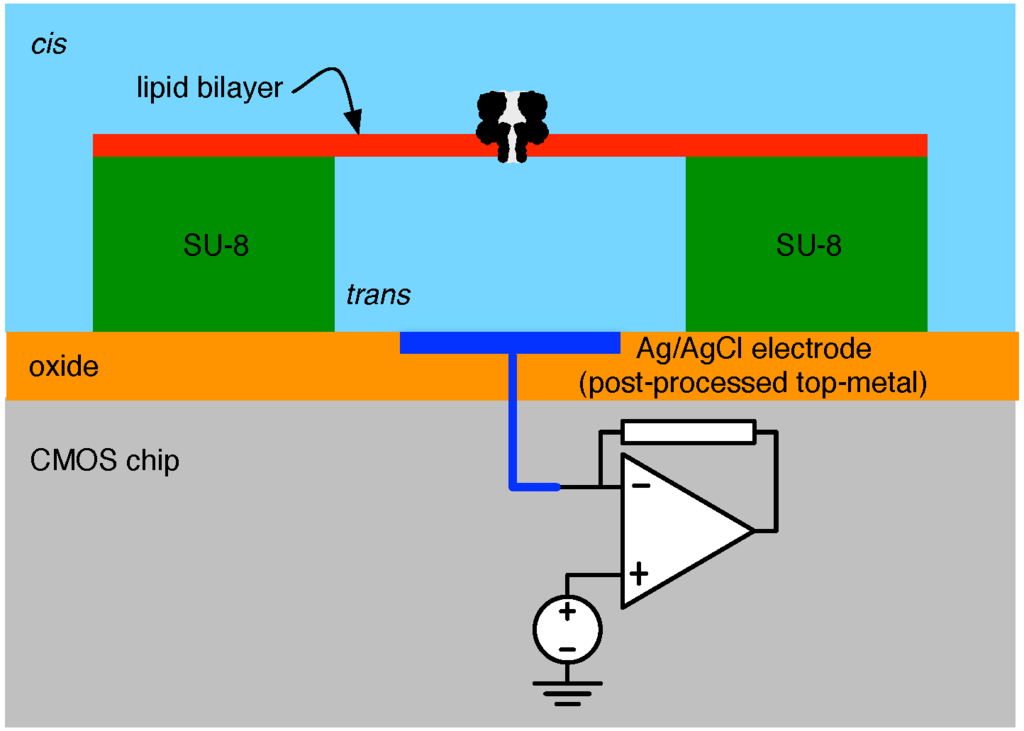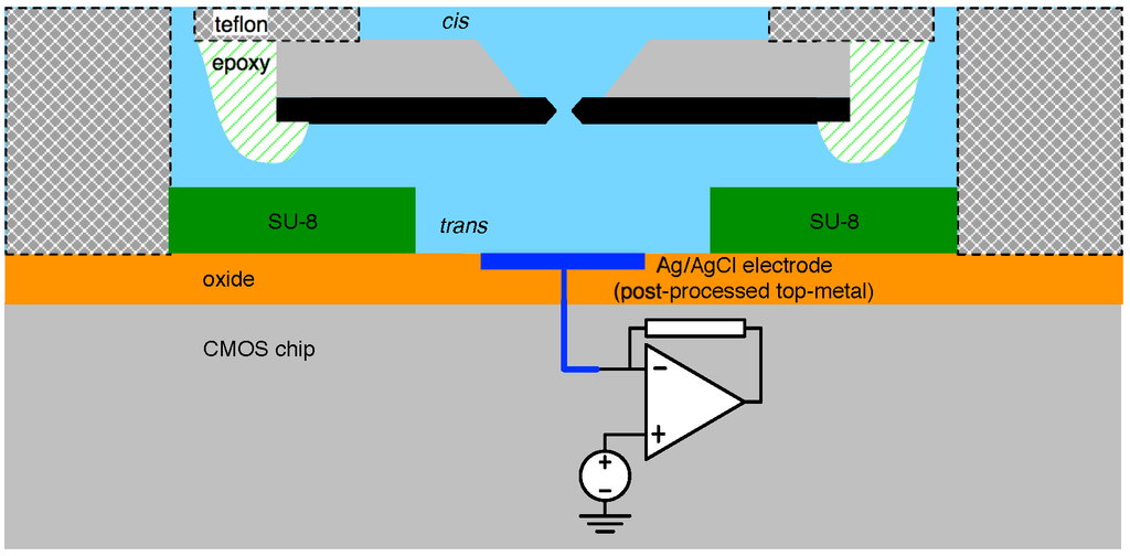 - Rosenstein, J.K.; Ramakrishnan, S.; Roseman, J.; Shepard, K.L. Single Ion Channel Recordings with CMOS-Anchored Lipid Membranes. Nano Lett. 2013, 13, 2682–2686. [Google Scholar] [CrossRef] [PubMed]