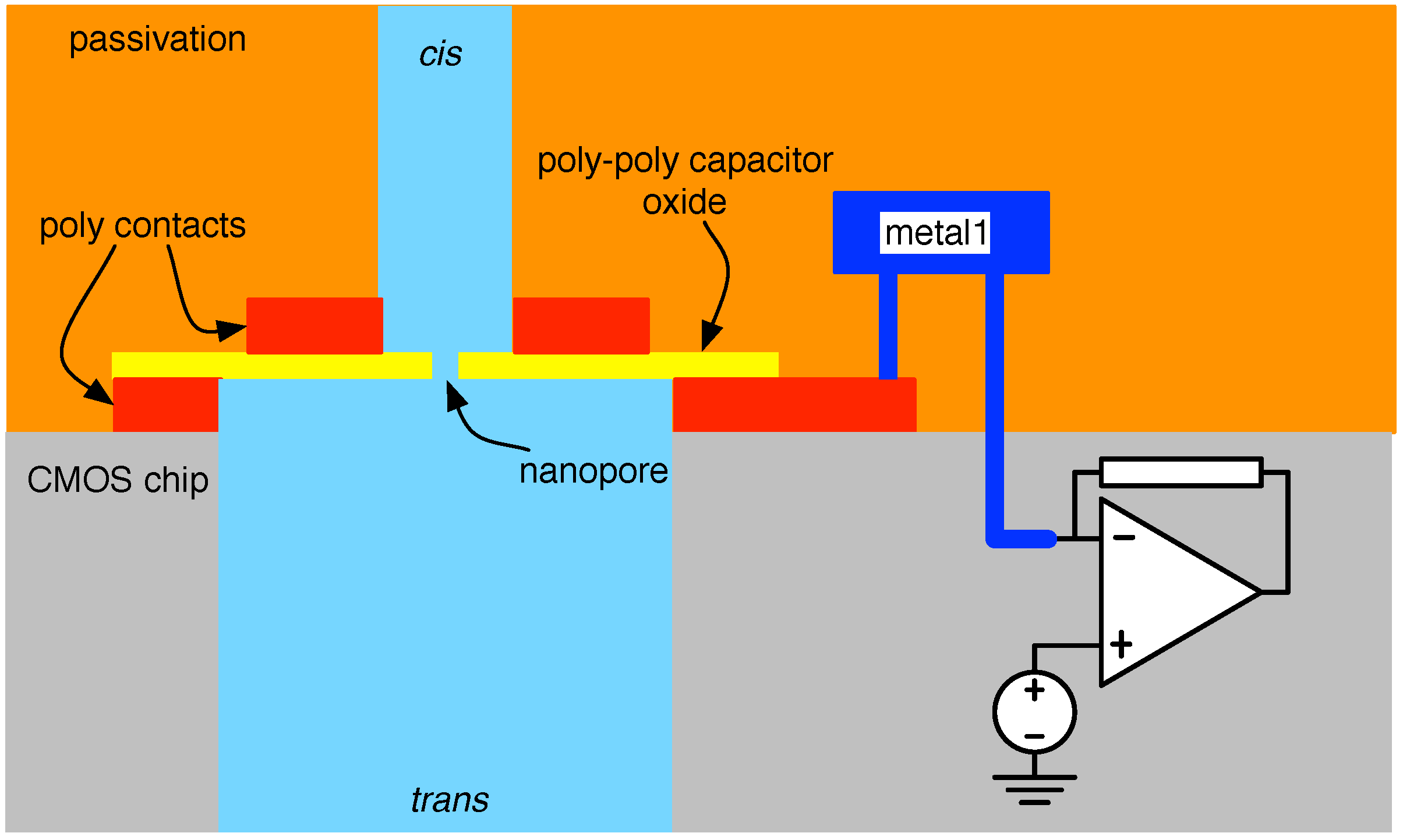 In general, then, the design of the nanopore-CMOS interface seeks to achieve connections with minimum total capacitance: