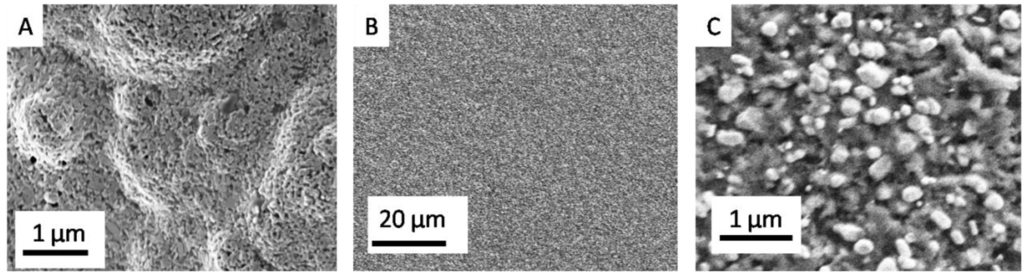 Representative SEM micrographs obtained before (A) and after dropcast deposition (B,C). (C) represents PcH2-tBumodified Au electrodes (B) at higher magnifications.