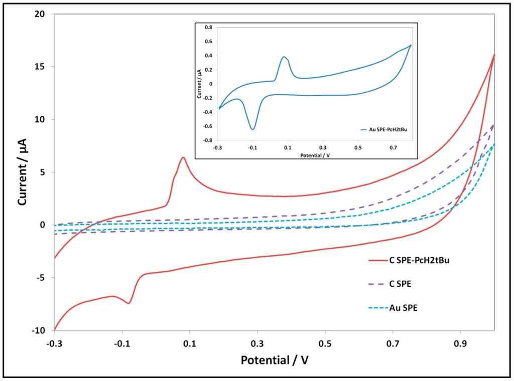 The modified electrodes are also characterized by cyclic voltammetry. We performed cyclic voltammetry measurements of the modified electrodes in KCl (0.1 M) and compared them with CV of the bare electrodes. The results are shown in Figure 2. The Au SPE-PcH2tBu presents an oxidation peak at 0.08 V and its reduction at −0.1 V, while the C SPE-PcH2tBu shows an oxidation peak at 0.08 V and its reduction at −0.08 V.